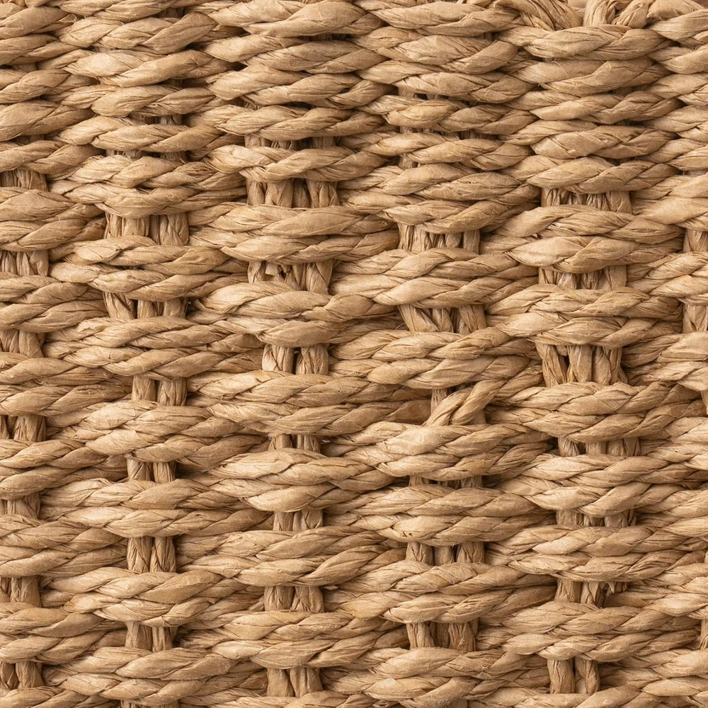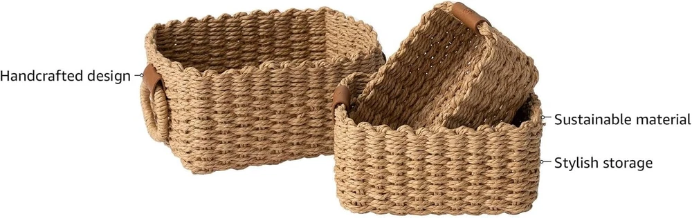 LA JOLIE MUSE Small Wicker Baskets for Organizing, Recycled Paper Rope Desert Product Details Material: Paper Color: Desert Brand: LA JOLIE MUSE Shape: Rectangular Product Dimensions: 9.05"D x 7.08"W x 4.72"H ARTFULLY CRAFTED FROM SUSTAINABLE MATERIALS - Woven from the sturdy embrace of recycled paper certified by FSC (Forest Stewardship Council), each captivating storage basket is adorned with the refined elegance of vegan leather trimmings and graceful circular handles. This seamless fusion of style and utility shows our commitment to sustainability, enhancing your living space. HANDWOVEN SHELF BASKET BINS - This meticulously handcrafted storage bin set melds lightweight construction with outstanding durability. Each captivating storage basket is infused with a harmonious solid color, effortlessly complementing various home decor styles. Adorned with refined vegan leather trimmings and graceful circular handles, these baskets transcend functionality to become integral works of sophisticated art for your living spaces. VERSATILE STORAGE SOLUTIONS - This set, comprising three convenient sizes, offers the flexibility to creatively organize a wide range of storage needs. Whether enhancing your nightstand decor, optimizing bathroom shelving, or decluttering living room surfaces, these baskets seamlessly adapt to various spaces within your home. FLEXIBLE & PORTABLE - Created with convenience in mind, this set of storage baskets is equipped with easy-grip ring handles, allowing effortless portability throughout your home. Despite their lightweight design, they provide generous space for storing a wide range of household essentials. SIZE & DIMENSION - Our range of shelf baskets with handles provides three sizes to meet diverse storage needs: Large Basket: 10.4" L x 7.7" W x 5" H; Medium Basket: 8.7“ L x 5.9" W x 3.9" H; Small Basket: 7.5" L x 4.7" W x 3.2" H.