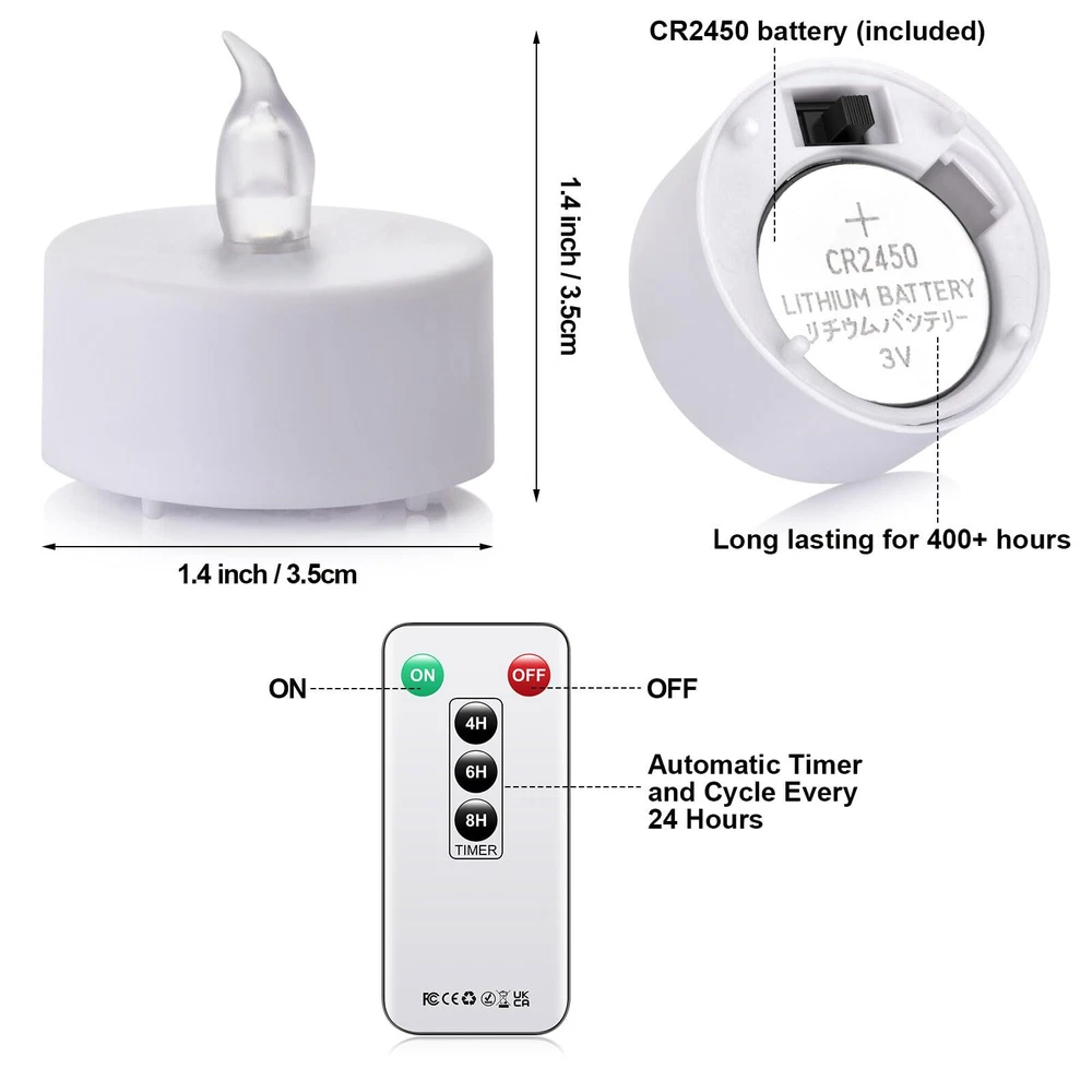 remote control tea lights ⭐With timer function: One click on or off, saving you more time and making it more convenient to use. The remote control can control a range of up to 8-10 feet.You no longer need to worry about putting the tea lights too high and causing trouble, nor do you need to manually turn them on or off one by one. With them, you will no longer choose tea lights without remote controls ⭐2450 High Capacity Battery: Each of these shared lights contains a CR2450 battery, which can last for up to 400+hours, 15 times longer than a regular burning tea light, ensuring that you continue to work throughout the entire holiday or event ⭐Ideal for holiday parties and home decor - These flameless tea lamp candles are perfect for creating a warm and romantic atmosphere and can be widely used for decorating weddings, holiday gifts, parties, birthdays, gardens, restaurants, Christmas, Valentine's Day, Halloween, Diwali, home decor, or other occasions ⭐Safe to Use - These bright and lifelike flameless tea candles have no fire hazards, no fire risk, no smoke, and no dripping wax. It won't burn and is perfect for enjoying romance with family, friends, and pets ⭐High-quality Tea lights: A package include 12tea lights candles and a remote control. We are been on safe and quality materials. To ensure great experience to user