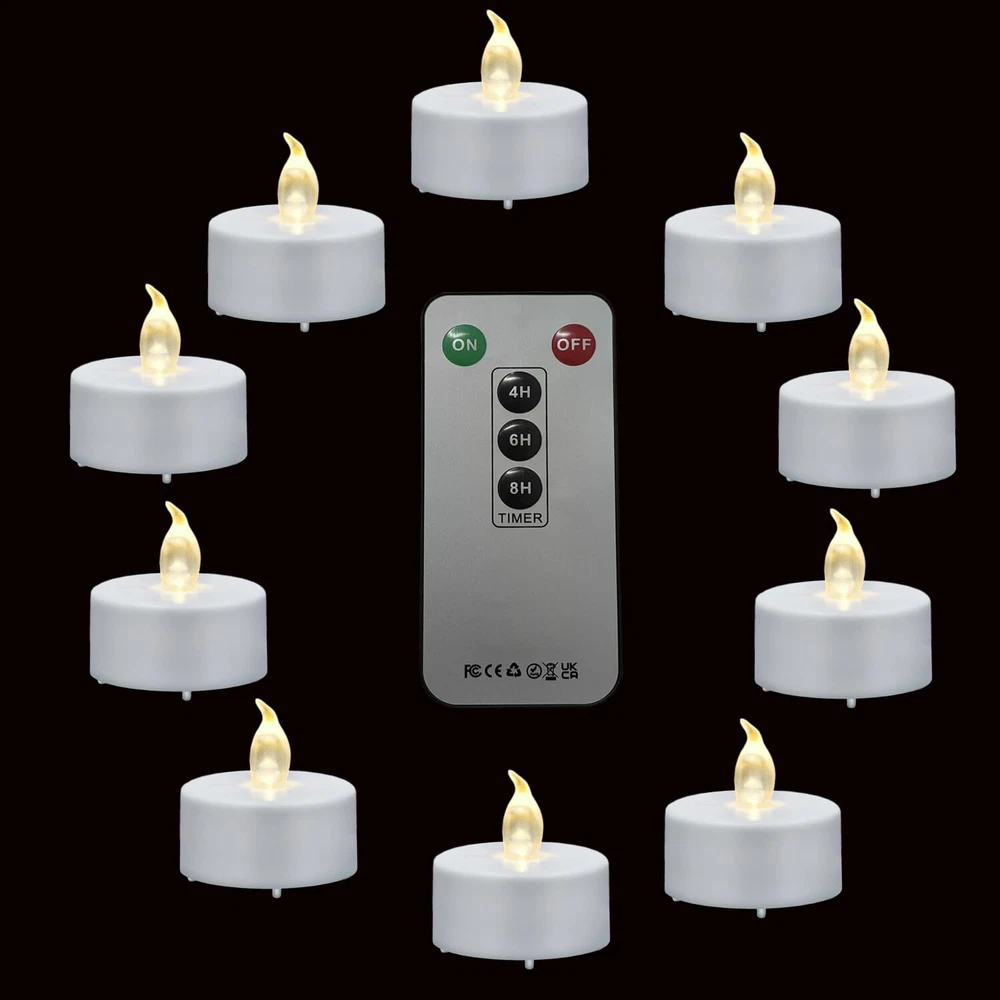 1.Remote controlled tea light with timer - easy to operate, you no longer need to manually turn on or off candles every day, which can save more time. You can also put these small tea lights inside the lantern and hang them on the porch. You can use a remote control to turn them on or off, which makes ordinary tea lights without a timer more convenient and widely applicable. 2.Large capacity batteries - These remote control candles use 2450 high capacity batteries and can provide up to 400 hours of continuous lighting, which is 15 times longer than the lighting time of traditional burning candles. This can ensure that the tea candle continues to work throughout the entire holiday period. The battery can be easily replaced at the bottom. 3.Safe and risk-free - These bright and lifelike flameless tea candles have no fire hazards, no fire risk, no smoke, and no dripping wax. Enjoy romance with family, friends, and pets. 4.Create an atmosphere - These tea lamp flameless candles are perfect for creating a warm and romantic atmosphere, and can be widely used for decorating weddings, holiday gifts, parties, birthdays, gardens, restaurants, Christmas, Valentine's Day, Halloween, Diwali, home decor, or other occasions. 5.100% satisfaction guarantee: We believe in the integrity of the brand and test the products one by one. If you are still not completely satisfied after receiving our flameless tea lamp, please contact us immediately for support, and we will solve the problem for you as soon as possible.