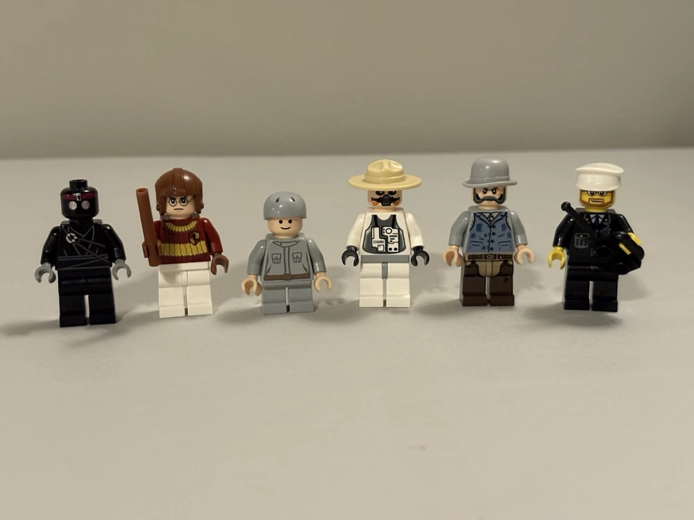 24 mifigure lot with all pieces and accessories intact, no damage. Horse with Gold armor and a yellow crab included. Detailed list: 1 Star Wars droid, 1 Hoth soldier, 1 bounty hunter 1 Lone Ranger cowboy 3 City robbers, 3 city police officers, 1 forest ranger, 1 fire fighter 1 pilot 2 LEGO Castle figures 1 mechanic 1 foot clan soldier 1 Marvel Echo figure 1 LOTR Sam figure 1 Lego Classic boy figure 1 Voldemort, quidditch Harry, 2 students, old Snape figure