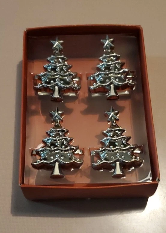 LENOX HOLIDAY NOEL NAPKIN RINGS HOLDERS SILVER CHRISTMAS TREE SET OF 4 EUC