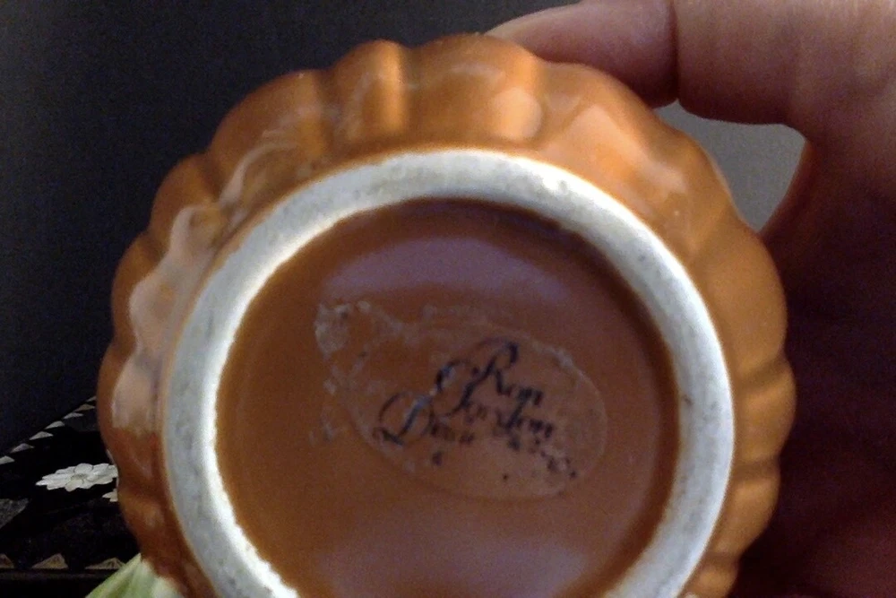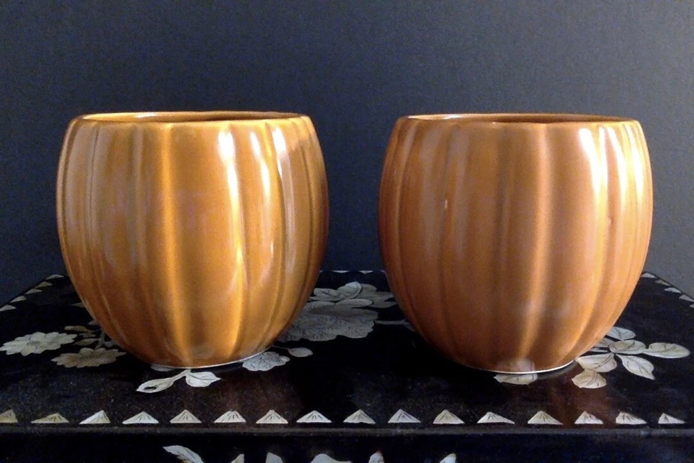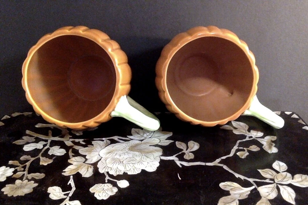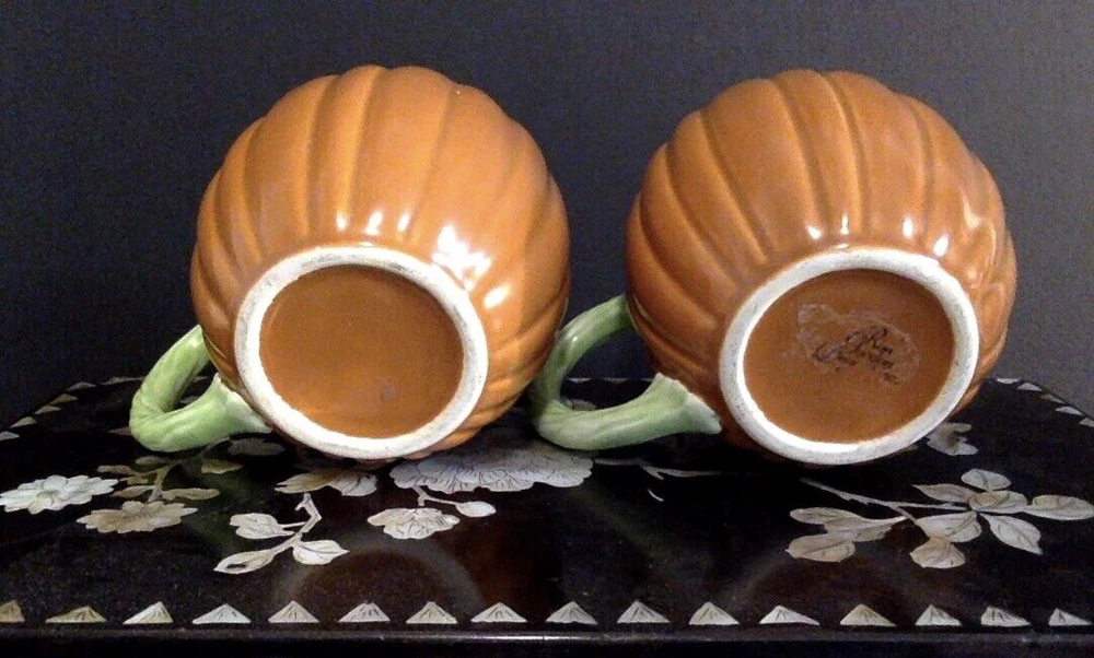 EXCELLENT USED CONDITION, LOOKS ALMOST-NEW, SEE PHOTOS. One mug has a partial label on the bottom, so I was able to identify the maker as Ron Gordon. These look almost like majolica, very pretty. Measures approx. 3 inches tall and 3 inches wide. FAST SHIPPING via UPS ground, carefully packed. Thanks for looking, and enjoy!