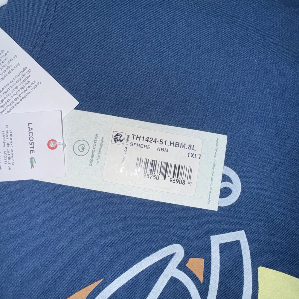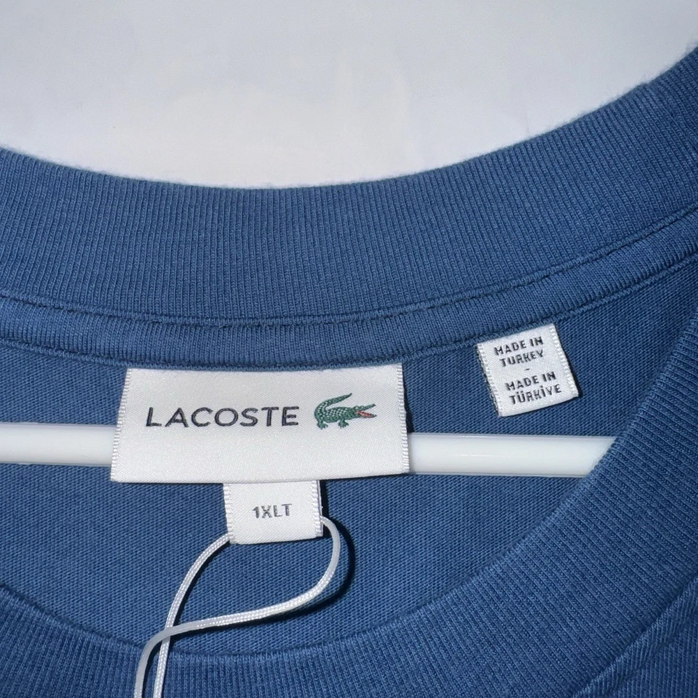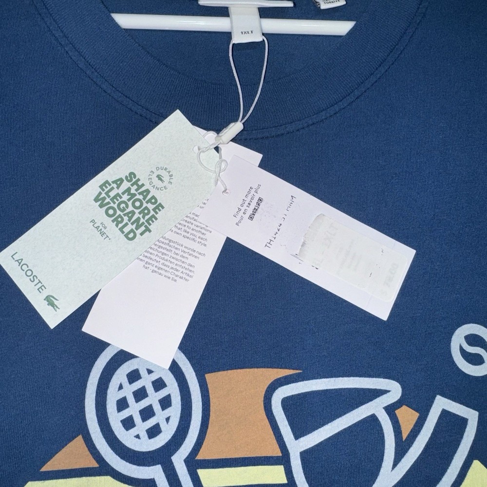 The Lacoste Retro Washed Effect Tennis Blue T-Shirt Sphere is a stylish and comfortable men's shirt in size XLT. Made of cotton knit fabric, this shirt features a graphic tennis print, short sleeves, and a crew neckline. The retro theme adds a unique touch, making it suitable for all seasons and easy to care for with machine washability. With its big and tall fit and lightweight design, this Lacoste T-shirt is a fashionable and practical addition to any man's wardrobe.