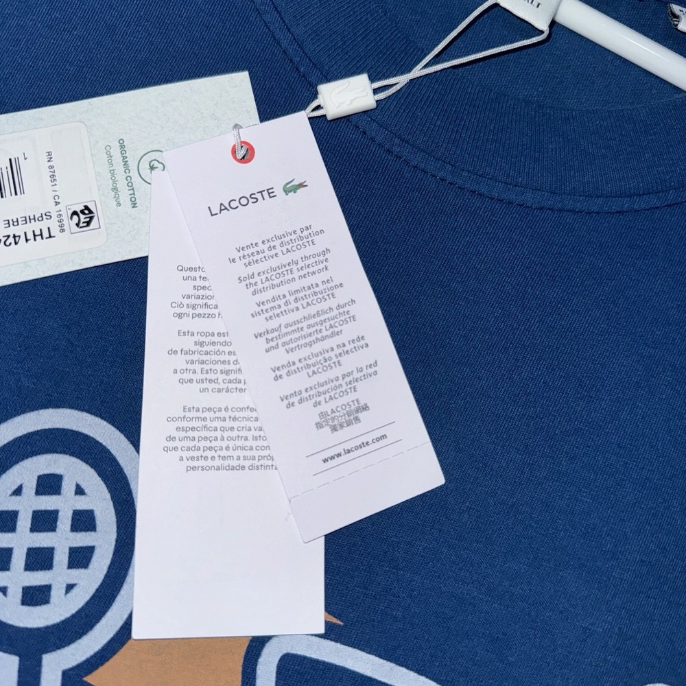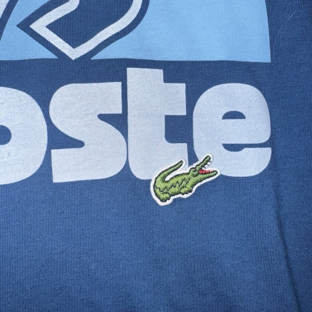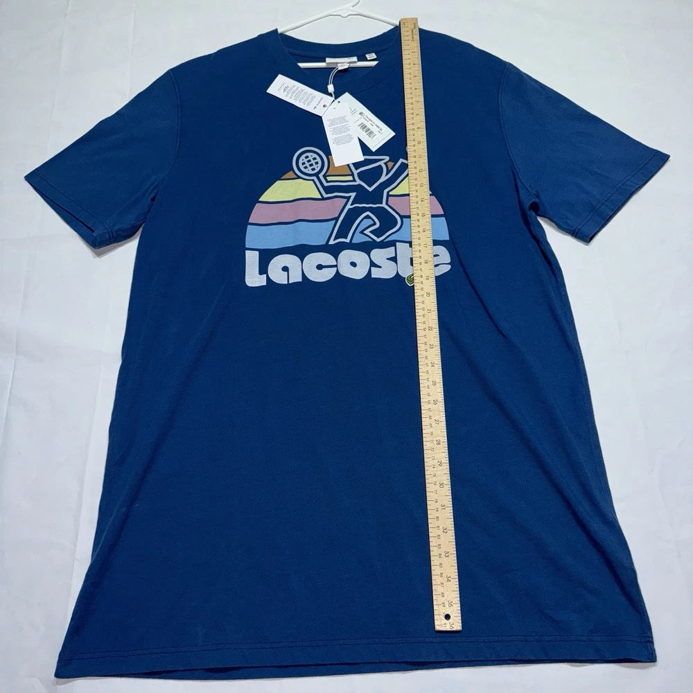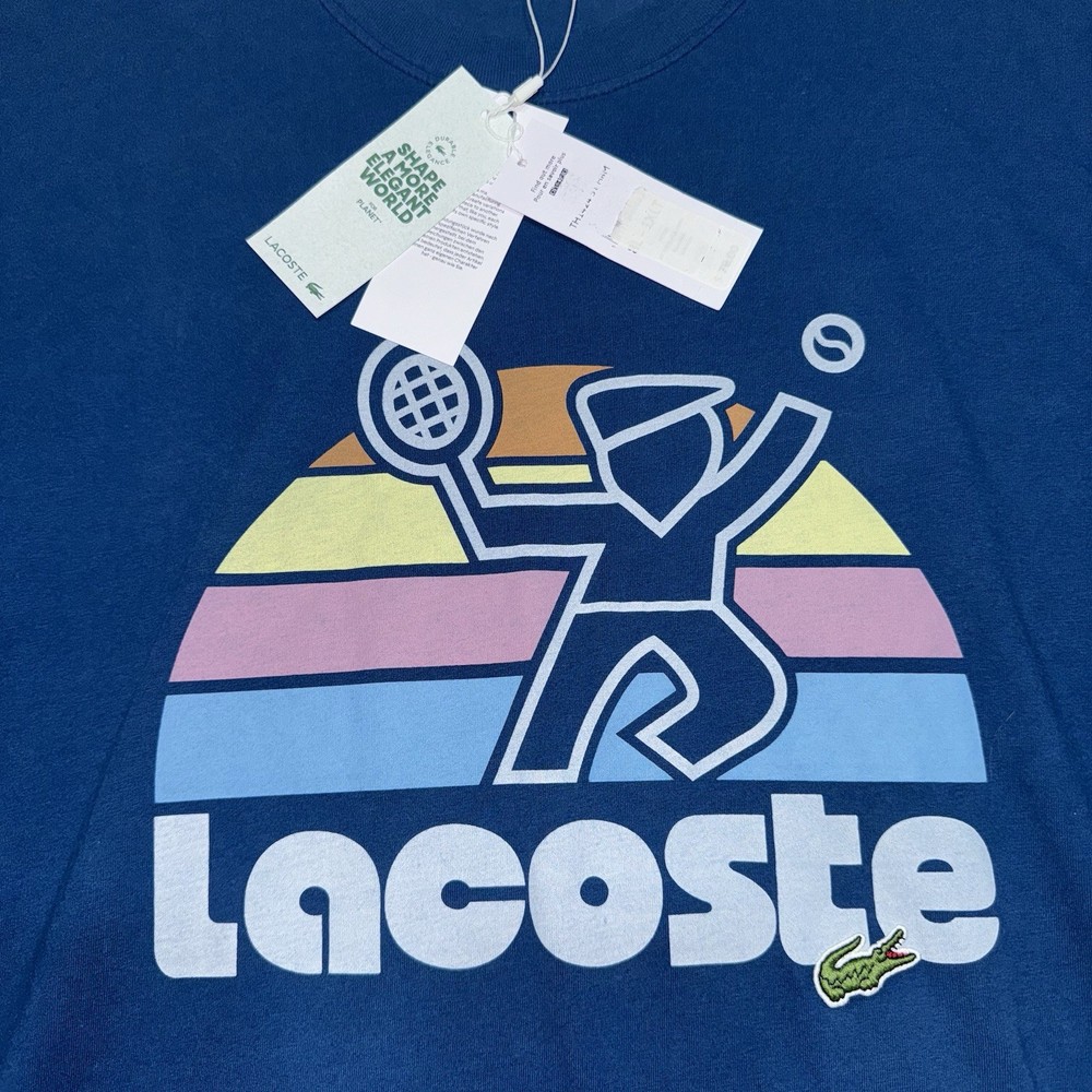 The Lacoste Retro Washed Effect Tennis Blue T-Shirt Sphere is a stylish and comfortable men's shirt in size XLT. Made of cotton knit fabric, this shirt features a graphic tennis print, short sleeves, and a crew neckline. The retro theme adds a unique touch, making it suitable for all seasons and easy to care for with machine washability. With its big and tall fit and lightweight design, this Lacoste T-shirt is a fashionable and practical addition to any man's wardrobe.