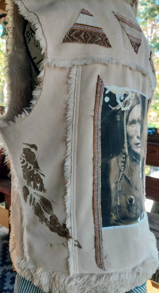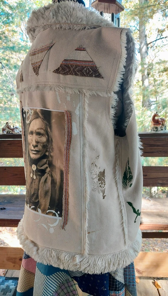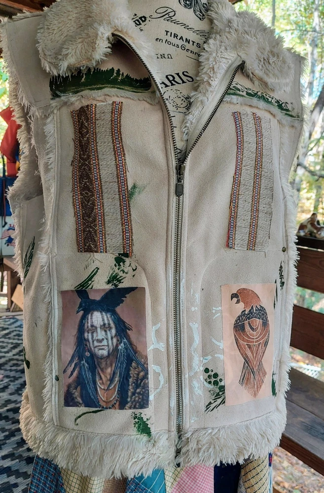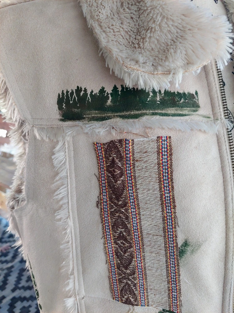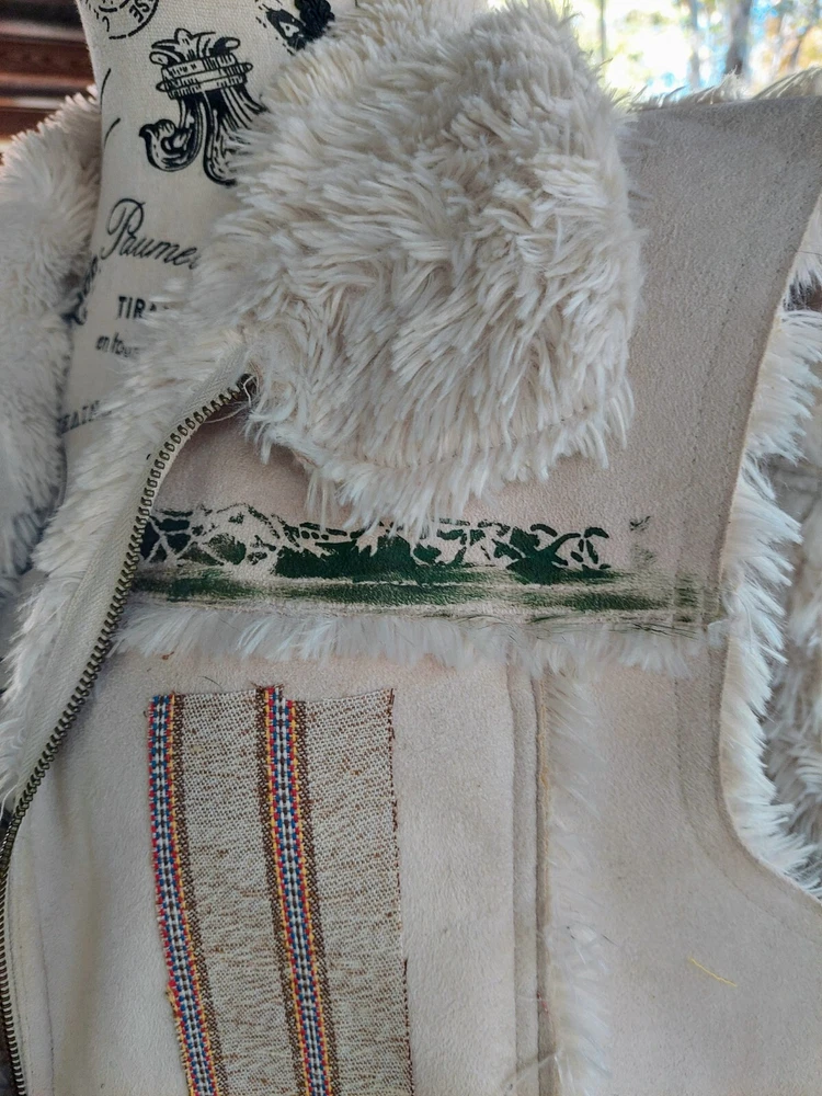 Faux Sherpa White Vest Wearable Art by Tennessee Rags Canvas, paint and appliques Bust 44"