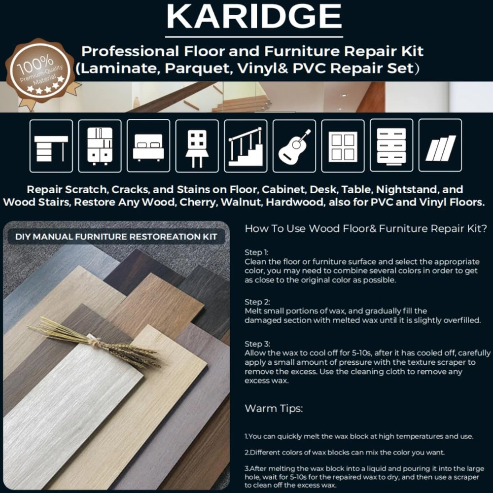 Free eBay listing template designed by dewiso.com Laminate Vinyl Floor Repair Kit with Heat Pen, 11 Colors Hardwood Floor Wax Wood Furniture Touch up Marker Linoleum Lvp Repair Kit Covers Scratches, Stains, Cracks, Holes for Floor, Door, Cabinet FREE AND FAST SHIPPING! Vinyl Floor Repair Kit: Say no to other complicated repair kits and steps, just need a wood floor repair kit for discoloration, stains, scratches, nicks, cracks, or holes on any wood floor and wood furniture luxury vinyl plank, laminate, bed, cabinet, table, frame, door, desk, etc. Your DIY repair work will become simple and professional, also save your time and money Upgraded Hardwood Floor Restoration Kit: After switching from "OFF" to "ON", the heat pen will be heated continuously, you don't need to press the button to heat all the time, after switching from "ON" to "OFF", the heat pen will go off. Anyone can use easily, even for left-handed people, and compared with wood filler and wood putty, our restoration hard wax bars is fast drying and waterproof, after curing, the wax is durable and abrasion resistant Wood and Laminate Floor Furniture Marker Repair Kit More Colors: 11 colors of hard wax strips and 8 wood repair markers can easily match your wooden furniture and floors, high-quality furniture repair repair markers can be used to repair surface scratches or draw wood grain. Apply from light to dark, pay attention to color changes, it is best to mark or blend colors as far as possible where they are not visible, or mix different colors to perfectly match the desired color with your wooden furniture, laminate flooring, vinyl flooring, and linoleum flooring Easy to Use Vinyl Floor Repair Kit: Just put the appropriate color of wax close to the damaged area of the melted wax until it overflows slightly. Wait for a while for the wax to dry, and then use a scraper to remove the excess wax. If necessary, you can use a lighter to speed up the heating of the wax. Excellent Customer Service: We provide a 100% satisfaction customer service team and support 1 year free replacement. If there are any issues with our laminate floor repair kit, we will respond to you within 24 hours Product We offer a 30-Day Return Policy on items which you are not completely satisfied with. You have the option for a full-refund or an exchange of the item. No returns are available on items shipped outside of the US . Shipping We offer Free Shipping to the US and ship within 2 business days of payment, usually sooner. We use UPS express shipping. That's why your products are usually delivered within 3 days . Contact We try our very best to make sure every customer is completely satisfied. If there's a problem , message us! We're happy to help. 24/7 live chat available.