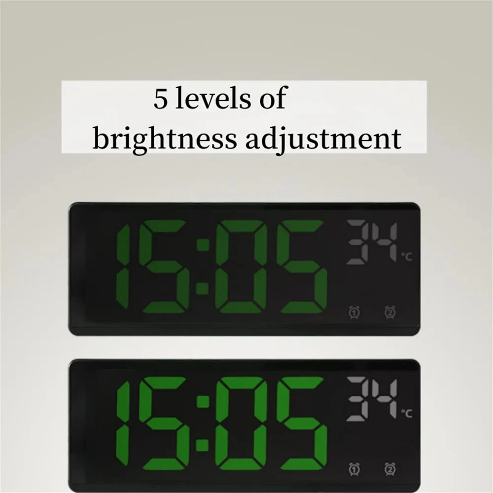 Function 1. Two Display Mode Press and hold the + key to switch the display mode. (1) Time+temperature is displayed on the same screen (2) "Time+temperature" and "Date+temperature" are displayed cyclically 2. Two sets of Alarms Support to set Alarm frequency :5/6/7 5:Alarm rings from Monday to Friday 6:Alarm rings from Monday to Saturday 7:Alarm rings from Monday to Sunday 3. 5 Levels of Brightness adjustment 4. Voice control function (available when only powered by battery) 5. Snooze function snooze 5 minute 6. Power saving mode 7. Time memory function(available when powered by battery and plug in use at the same time) 8. Night Mode If night mode is on,Brightness darkens at night (22:00-6:00) 9.Anti-disturb function at night In the non-setting state, you can press and hold the snooze button for 3 seconds to turn off the display to prevent the screen from interfering with sleep at night. After entering the screen-off mode, you can press any key to turn on the display, but the voice control cannot turn on the display 10.12/24 hour format switch (1)Time Display (2)Long press the MODE button 24Hr Display (3)Press UP or DOWN can switch to 12Hr (4)Press the MODE button Time setting display (5)Hour digits flashing Product Show Body Color :Black Body Shape:Rectangle Words:As picture show Material of Screen:Mirror Size: 17.4*6.8*2.3cm Voice control: clap your hands or knock on the table to wake up the alarm clock NOTE 1:Take the protective flim on Clock Screen,it will be brighter. NOTE 2:It will go off after 10 seconds when only powered by AAA Battery(Not Included) Clap your hands or knock on the table to wake up the alarm clock If you want screen always on,please plug in use.