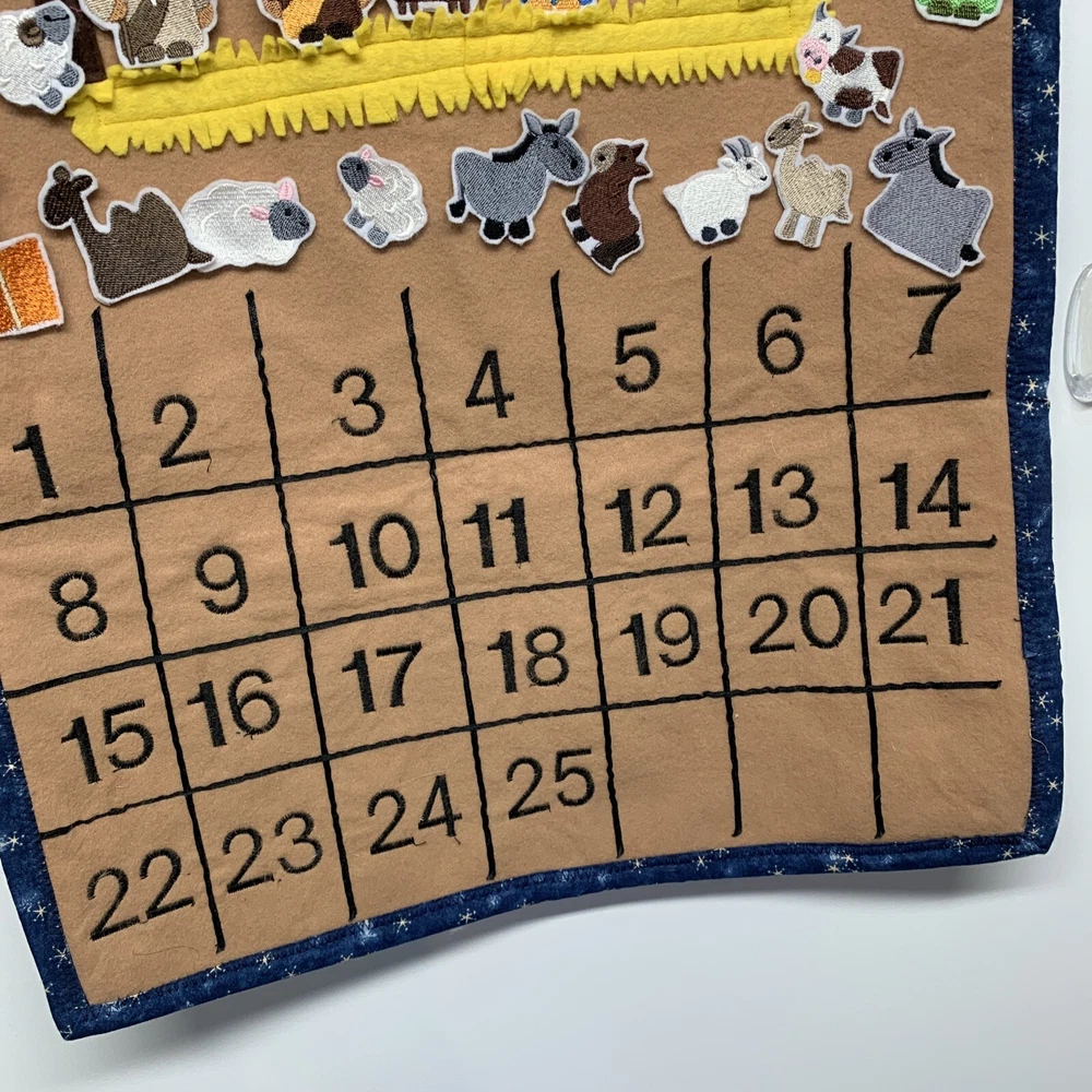Super cute advent calendar! This is made out of felt and fabric. Each day has a embroidered figure to be placed in and around the stable. Includes various animals, palm trees, hay bale, shepherds, 3 kings, star, angels and of course Joseph, Mary & Baby Jesus. Each piece has hook & loop attached to the back to secure to the stable area. Excellent pre-owned condition! This item is large and measures 27” height x 18” across.