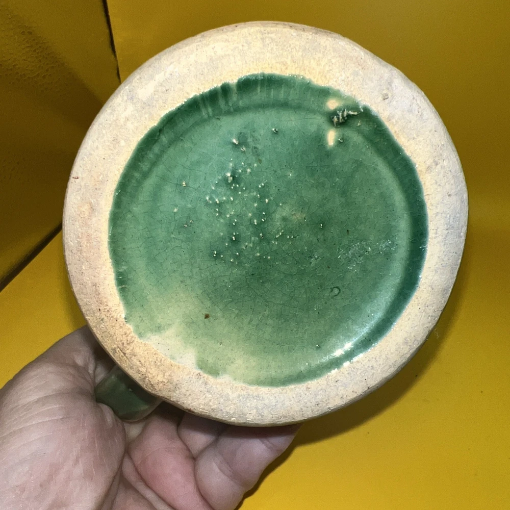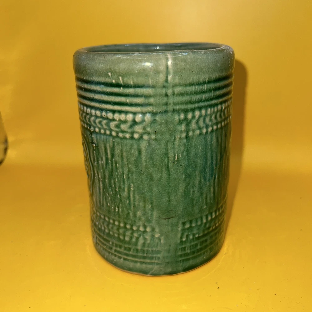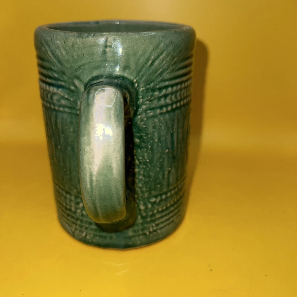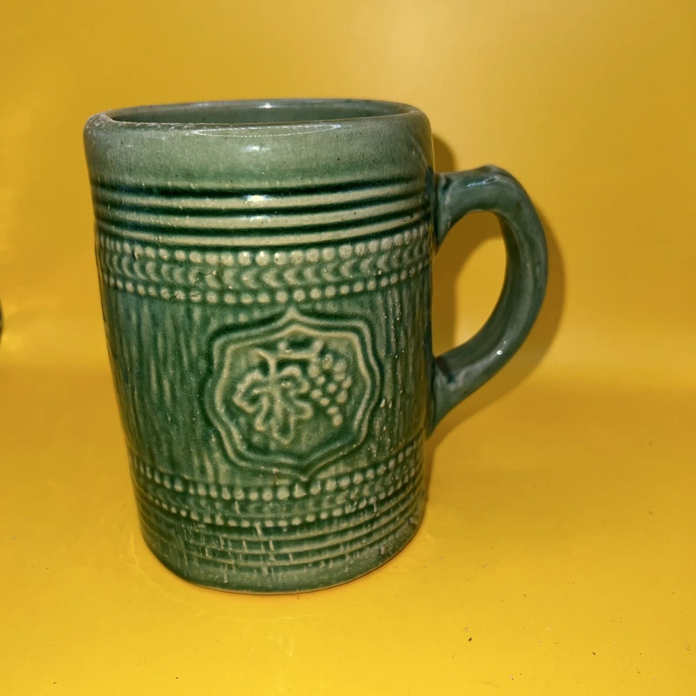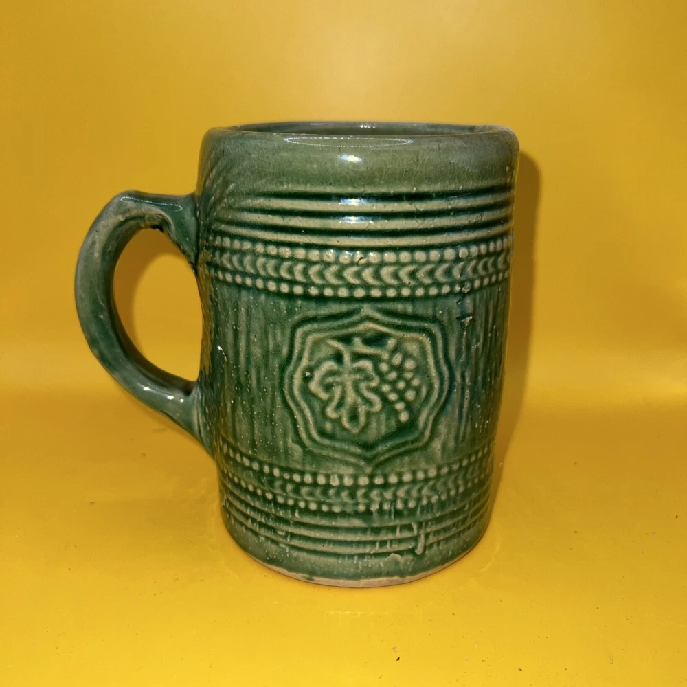 Embrace the charm of the early 20th century with this Large Heavy Antique McCoy Pottery Green Grape and Leaf Stoneware Mug. Crafted between 1920 and 1929, this authentic piece features a lush green leaf pattern that wraps around the exterior, exuding a timeless elegance that's sure to compliment any home decor. The mug stands at an impressive 5.25 inches tall with a robust diameter of 3 inches, making it ideal for a generous pour of your favorite beverage. Weighing in at 1.8 pounds, its substantial heft is a testament to the quality craftsmanship of the era. Whether for use or display, this mug is a genuine slice of Americana, celebrating the artistry of vintage pottery.