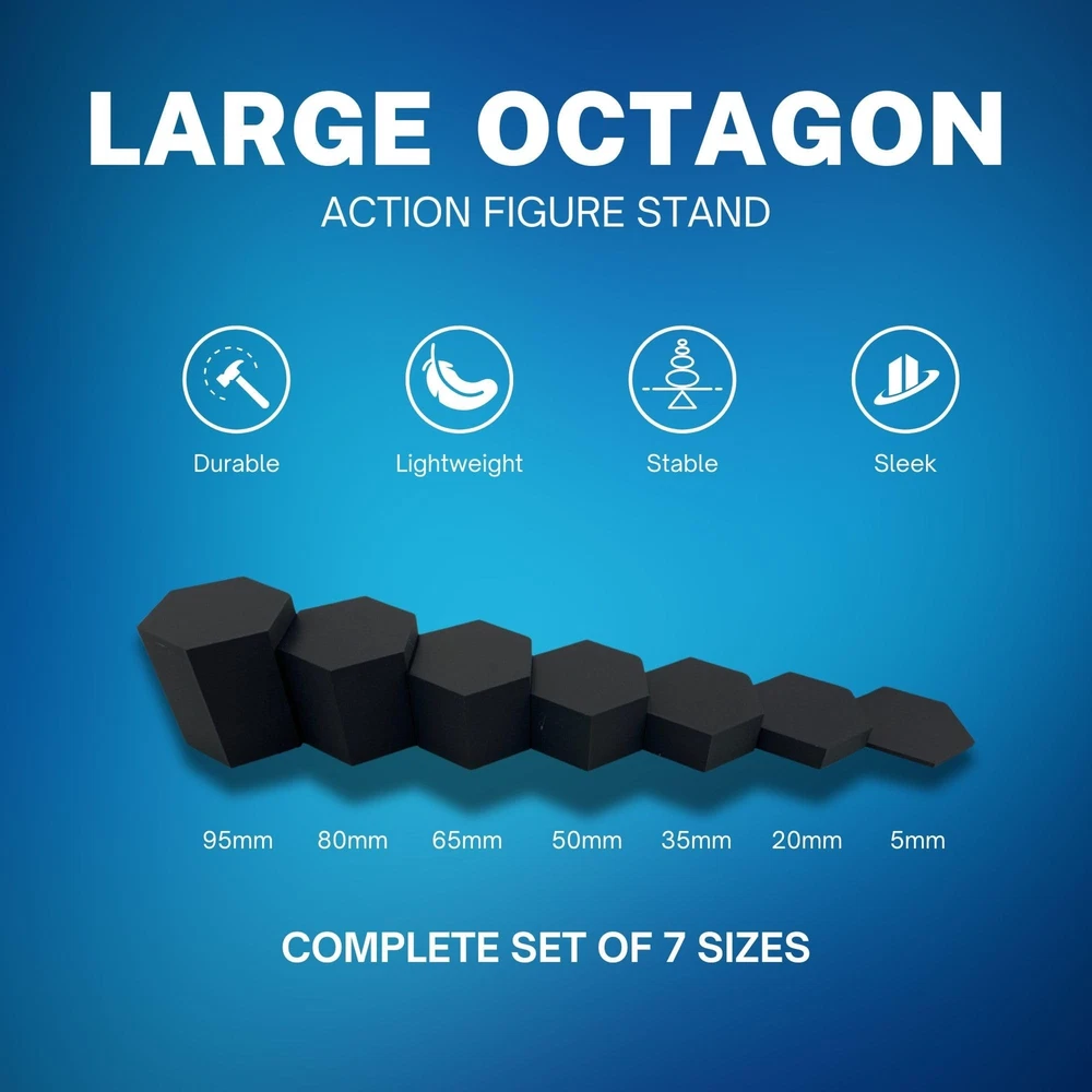 Large Octagon Action Figure Stand | Matte Finish | Black, (COMPLETE SET of 7 SIZES) Product Details Color: Matte Black Brand: Nexus Box Manufacturer: Nexus Box Color: Matte Black Manufacturer: Nexus Box Brand Name: Nexus Box Perfect For: Collectors seeking a professional display solution Dynamic setups for photography or exhibitions Enhancing retail presentations Fans who appreciate meticulous organization Dynamic Displays Made Simple: Our stands not only serve as a practical tool for collectors but also enhance the overall presentation of your figures. Provide a clean, minimalistic backdrop that makes your figures the stars of the show. Collect, Display, Impress: Transform your action figure collection with these elegant stands. Ideal for casual collectors or serious enthusiasts, our stands help you tell a story with your figures. Add our Dynamic Octagon Action Figure Stands to your setup today and showcase your figures like never before! Easy to Use: Flat top design makes it easy to swap figures in and out, perfect for collectors looking to refresh their display or expand their collection. Transform your action figure collection with our Large Octagon Action Figure Stands. Available in sleek black, these versatile stands offer the perfect showcase for your prized figures. Available in different sizes. 95MM 80MM 65MM 50MM 35MM 20MM 5MM