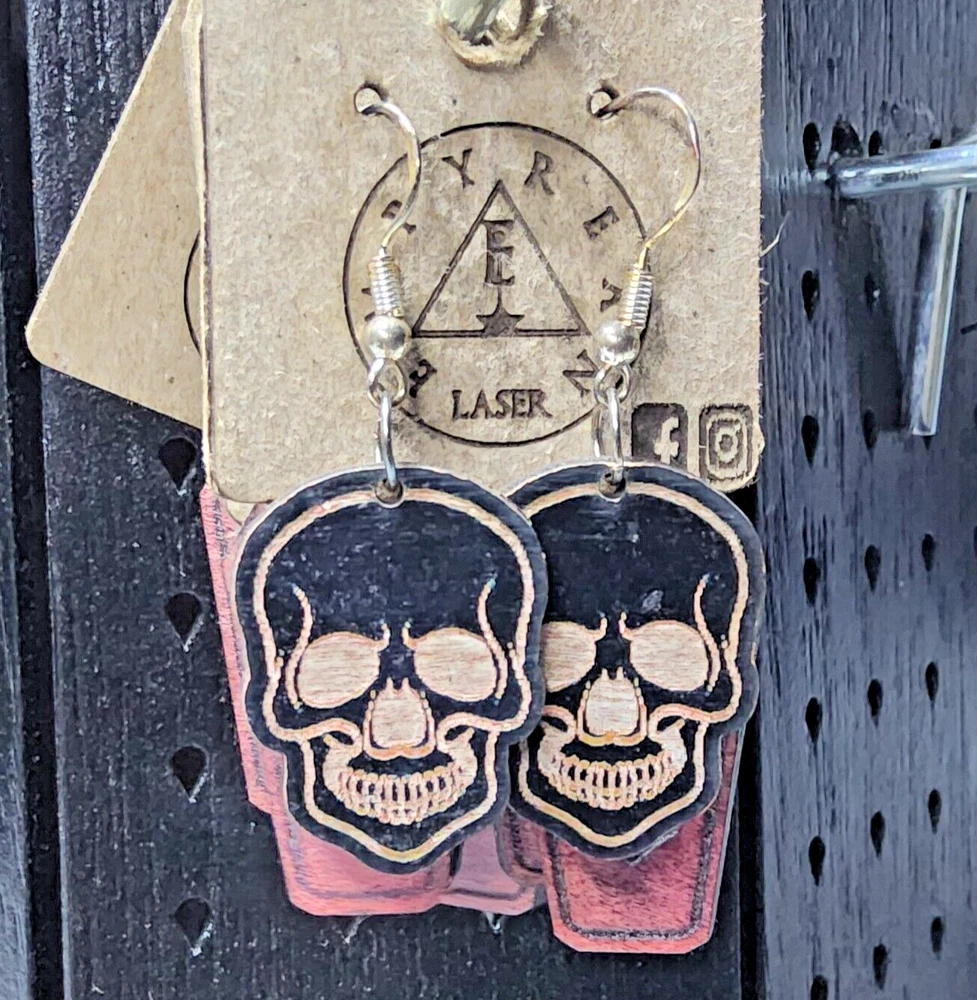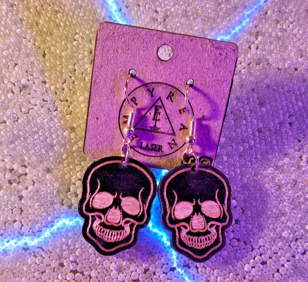Laser engraved cut black skull custom art earrings horror fashion goth halloween Sketched a pic of a black skull on tablet, then transferred design to my laser machine to engrave then cut out earring shapes. Measures 1"h x .75"w x 1/4"d. Loaded with hypoallergenic metal ear hooks. Check out plenty of other lasered creations of mine in shop. Order a few pieces and I'll give you a bundled art deal. Not doing customs at the moment but may be persuaded to fire up the laser for right project. Ebay reselling keeps me busy. Message me to find out. Thanks again for visiting my Ebay shop. ***Treasure Suite offers you many pieces of my art prints now*** ###This section is for laser cut sublimation prints of my digital art. Measurements vary by piece. ### *Welcome to my unique collection of digital art, where creativity meets craftsmanship! Each piece in this category features my original digital designs, heat pressed into vibrant sublimation prints on laser cut whiteboard material. Some are engraved then hand painted. These art pieces are not just decorations, they are collectibles that bring a touch of gothic, rock and roll, horror, pin-up, and lowbrow art into your space. *perfect for:* *man cave *castle *bungalow *abode *domicile *penthouse *flat *cabin *studio *boutique hotel *yacht *etc *These pieces make fantastic gifts for art enthusiasts and collectors alike. Who doesn't enjoy vibrant digital art of out of this world space huntresses, demon witches, cyberpunk vixen cyborgs, spooky mistresses, hearses, hotrods, and so on? ***May consider custom orders of laser cut or engraved items.***