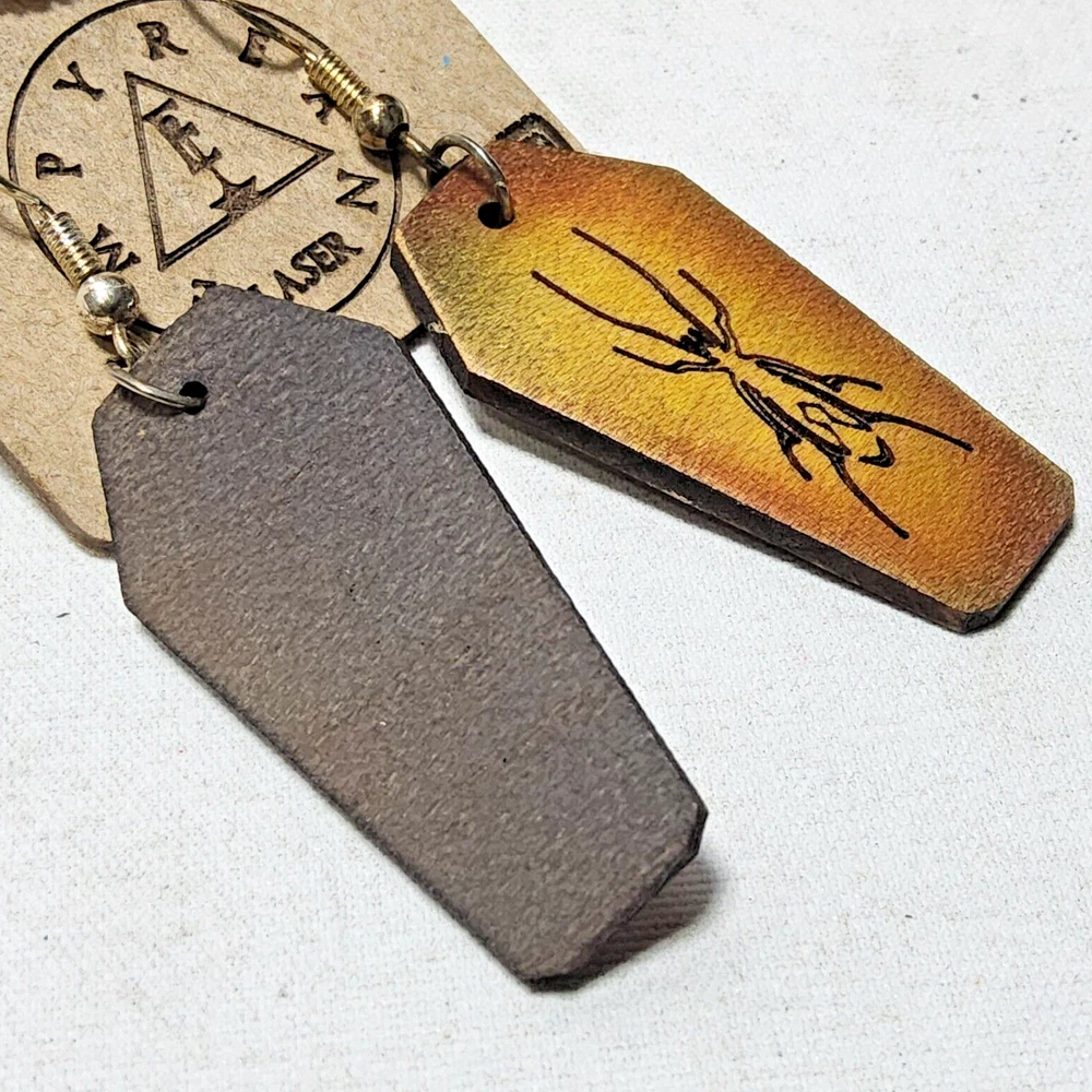 Laser engraved cut coffin spider earrings hallowen custom art horror fashion Based off a coffin spider design i made digitally. Then sent through laser machine. Made on maple. Measures 1.5"h x .75"w x 1/4"d. Loaded with hypoallergenic metal ear hooks. Check out plenty of other lasered creations of mine in shop. Order a few pieces and I'll give you a bundled art deal. Not doing customs at the moment but may be persuaded to fire up the laser for right project. Ebay reselling keeps me busy. Message me to find out. Thanks again for visiting my Ebay shop. ***Treasure Suite offers you many pieces of my art prints now*** ###This section is for laser cut sublimation prints of my digital art. Measurements vary by piece. ### *Welcome to my unique collection of digital art, where creativity meets craftsmanship! Each piece in this category features my original digital designs, heat pressed into vibrant sublimation prints on laser cut whiteboard material. Some are engraved then hand painted. These art pieces are not just decorations, they are collectibles that bring a touch of gothic, rock and roll, horror, pin-up, and lowbrow art into your space. *perfect for:* *man cave *castle *bungalow *abode *domicile *penthouse *flat *cabin *studio *boutique hotel *yacht *etc *These pieces make fantastic gifts for art enthusiasts and collectors alike. Who doesn't enjoy vibrant digital art of out of this world space huntresses, demon witches, cyberpunk vixen cyborgs, spooky mistresses, hearses, hotrods, and so on? ***May consider custom orders of laser cut or engraved items.***