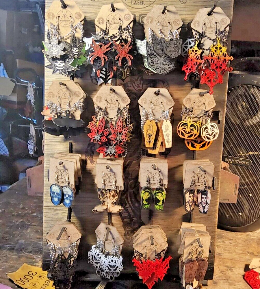 Laser engraved cut crucifix themed earrings hallowen custom art horror fashion ox blood red western coffin Made from one of my ornate crucifix coffin designs on laser cutter/engraver. No 2 are alike, so you will get slight variation from pics. Measures 1.5"h x .75"w x 1/4"d. Loaded with hypoallergenic metal ear hooks. Check out plenty of other lasered creations of mine in shop. Order a few pieces and I'll give you a bundled art deal. Not doing customs at the moment but may be persuaded to fire up the laser for right project. Ebay reselling keeps me busy. Message me to find out. Thanks again for visiting my Ebay shop. ***Treasure Suite offers you many pieces of my art prints now*** ###This section is for laser cut sublimation prints of my digital art. Measurements vary by piece. ### *Welcome to my unique collection of digital art, where creativity meets craftsmanship! Each piece in this category features my original digital designs, heat pressed into vibrant sublimation prints on laser cut whiteboard material. Some are engraved then hand painted. These art pieces are not just decorations, they are collectibles that bring a touch of gothic, rock and roll, horror, pin-up, and lowbrow art into your space. *perfect for:* *man cave *castle *bungalow *abode *domicile *penthouse *flat *cabin *studio *boutique hotel *yacht *etc *These pieces make fantastic gifts for art enthusiasts and collectors alike. Who doesn't enjoy vibrant digital art of out of this world space huntresses, demon witches, cyberpunk vixen cyborgs, spooky mistresses, hearses, hotrods, and so on? ***May consider custom orders of laser cut or engraved items.***