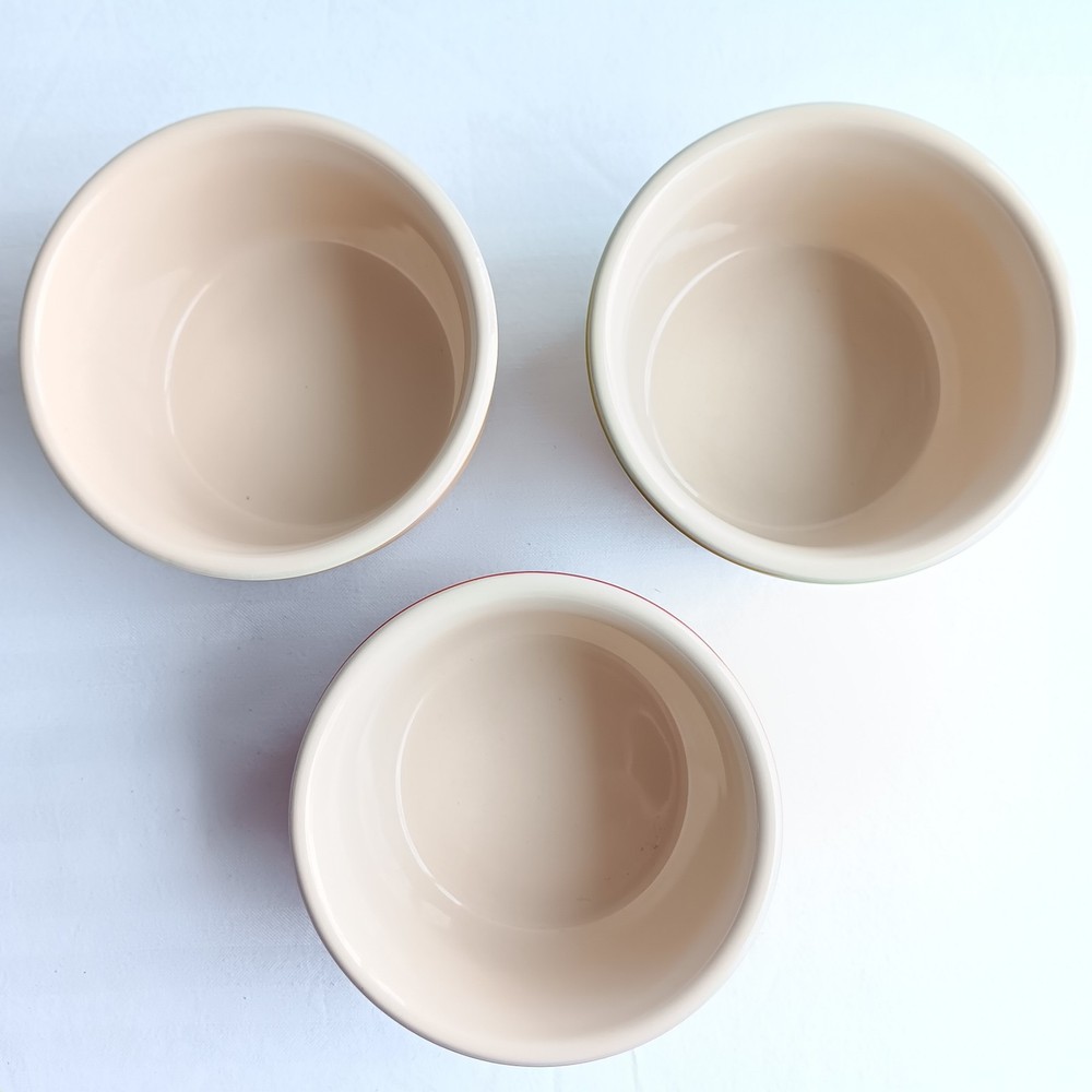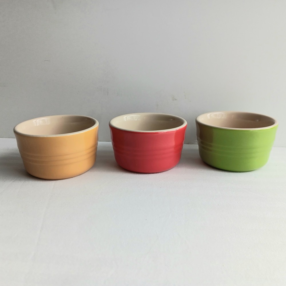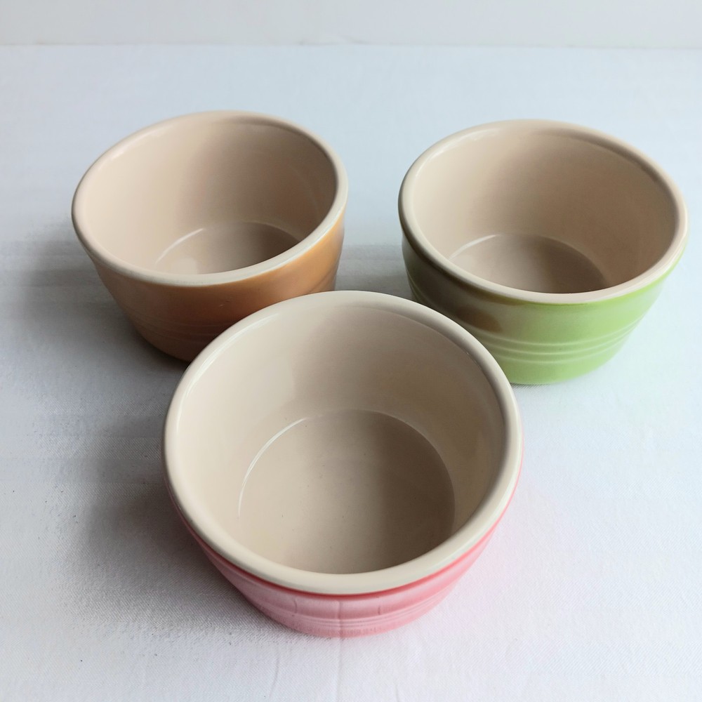 Add a touch of elegance to your kitchen with this Le Creuset Set of 3 Small Ramekin Custard Cups. Made in France from durable ceramic, these round, multicolored ramekins are perfect for baking individual servings of custards, soufflés, and more. With a 6 oz capacity and a 3.5" diameter, they are versatile and suitable for use in any type of oven. Upgrade your bakeware collection with these high-quality, ceramic-coated ramekins that are sure to impress your guests and elevate your culinary creations.