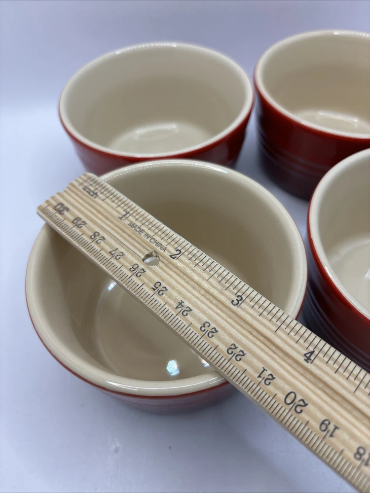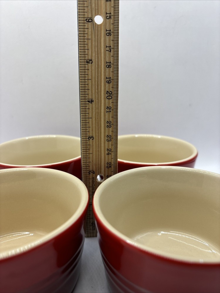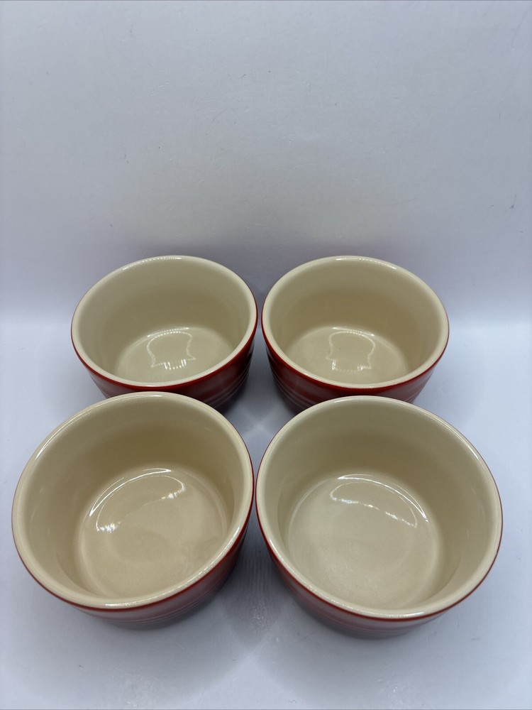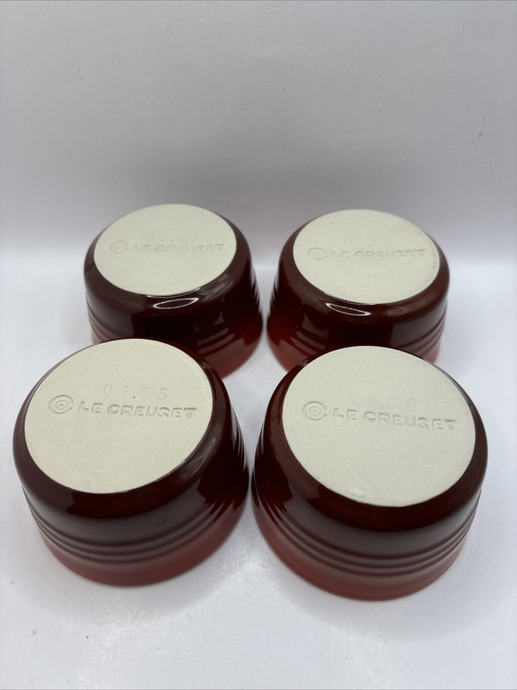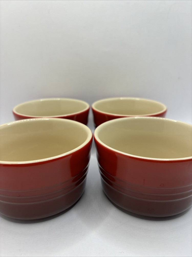 This is a set of 4 Le Creuset 7 ounce ramekins in red ombré. Ribbed texture. Cream colored interior. All in excellent condition B 4