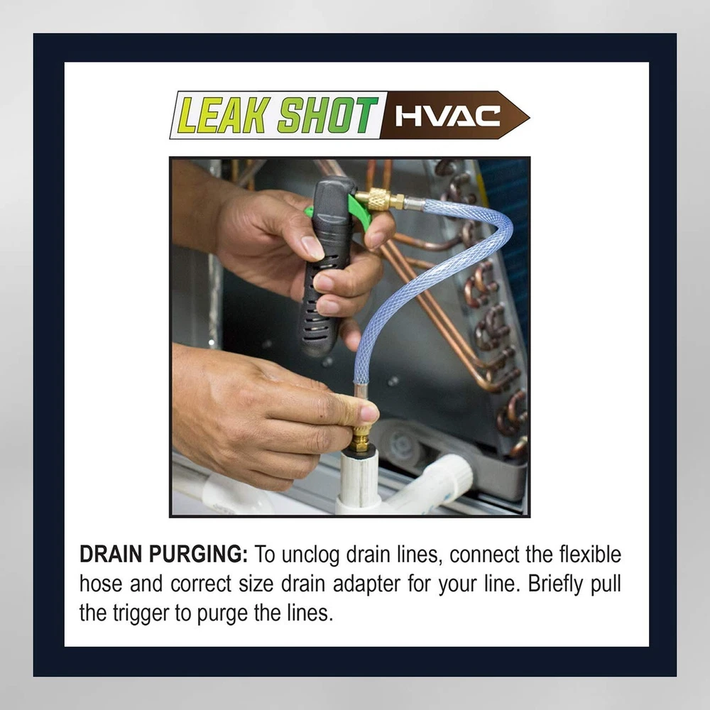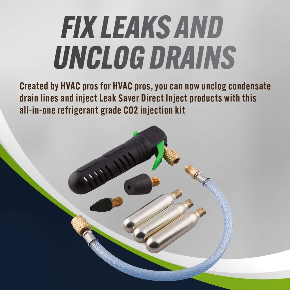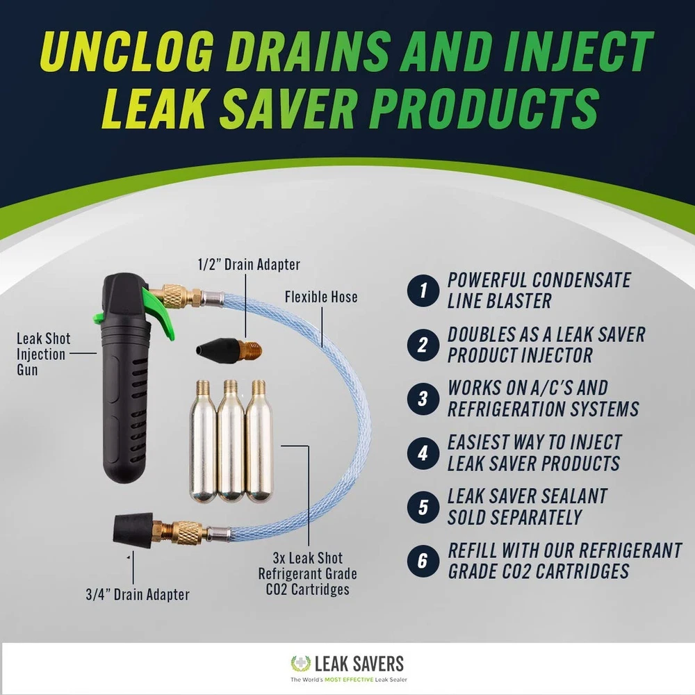 Leak Saver AC Drain Line Cleaner Tool & Leak Sealant Injector | Condensate Line Co2 Drain Gun | AC Drain Line Unclogger Description Features: BLAST AWAY CLOGS - Use our CO2 powered drain blaster to unclog HVAC condensate drain lines with ease. Includes 3 CO2 cartridges. AC LEAK SEALER INJECTOR - Our co2 cartridge drain gun doubles as an injector for our Leak Saver Direct Inject Leak Sealants & additives. (SEALANT SOLD SEPARATELY) NON-CONTAMINATING CO2 CARTRIDGES - Our cartridges are specially formulated to not contaminate HVAC and refrigeration systems. Please only refill with our Leak Shot CO2 Refrigerant Grade refills. KIT INCLUDES - 1 x Leak Shot Injection Gun | 3 x Refrigerant Grade CO2 Cartridges (multiple shots per cartridge) | 1 x 3/4in Rubber Condensate Line Adapter | 1 x 1/2in Rubber Condensate Line Adapter | 1 x Flexible Extension Hose. 100% SATISFACTION - We stand behind the quality and effectiveness of our products 100%. If for any reason you are not satisfied, please contact Leak Saver directly and we will make it right. Product Details: Product Dimensions : 6.5 x 1 x 9.6 inches; 12.17 ounces Item model number : LS-HVAC Date First Available : June 25, 2019 Manufacturer : Leak Saver Country of Origin : USA Best Sellers Rank: #78,057 in Tools & Home Improvement (See Top 100 in Tools & Home Improvement) #203 in Drain Augers #203 in Drain Augers Customer Reviews: 3.8 3.8 out of 5 stars 1,247 ratings Handling We will ship all orders within 3 business day of payment. Delivery We Do Not Ship Outside of the Continental US. Return Policy All items qualify for returns within 30 days of receipt. Buyer is responsible for return shipping on any item that is not damaged. Feedback We take our reputation seriously, we buy and sell online, so we understand the value of trust. If you are unsatisfied with your order, please contact us and we will work with you to resolve it to your satisfaction.