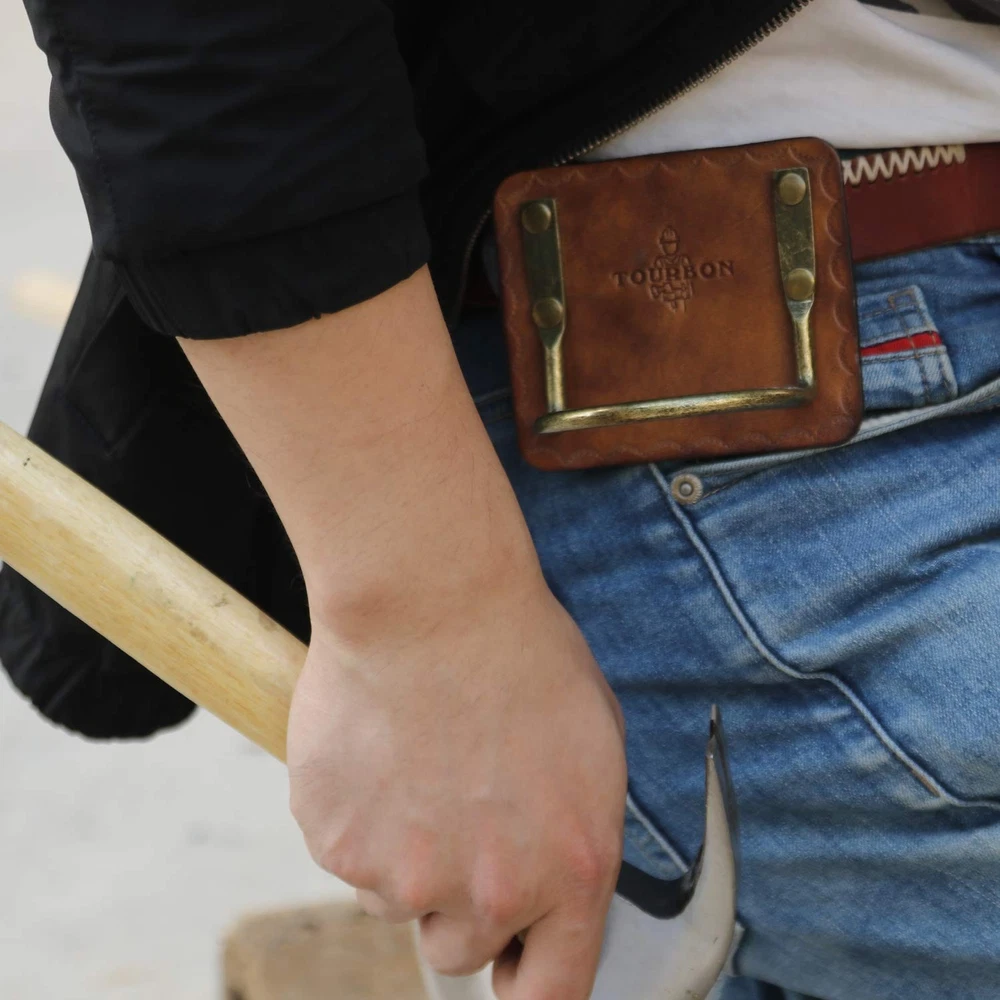 Leather Hammer Holder With Steel Loop 1.Designed with a wide steel loop for easy quick accessibility. 2.Keep your axe nearby with this tool holder pouch. 3. Rivets with caps for safety 4.Package: 1 pieces Hammer Holder 5. Fits Most models of hammers Leather Hammer Holster: tool holder made from leather and riveted cradle-style steel loop Steel Hammer Loop: Hammer hanger with cradle loop design to keep the hammer from moving, the inside dimensions of the hammer hook are 2.55" W from left to right and 1.85" D from front to back Enhanced Design: The tool holster has 4 rivets for reinforcement, to strengthen the fixed parts Fits 1.5" Width Belts: Approx. 1.96" belt loop that fits for a 1.5" belt, the holster can be positioned on a belt ready to receive a hammer or hatchet so your hands can be free to work Keep Tools at the Ready: This hammer hook keeps the axe safe and secure while allowing easy access, good for carpenters, electricians, framers, construction workers, and more