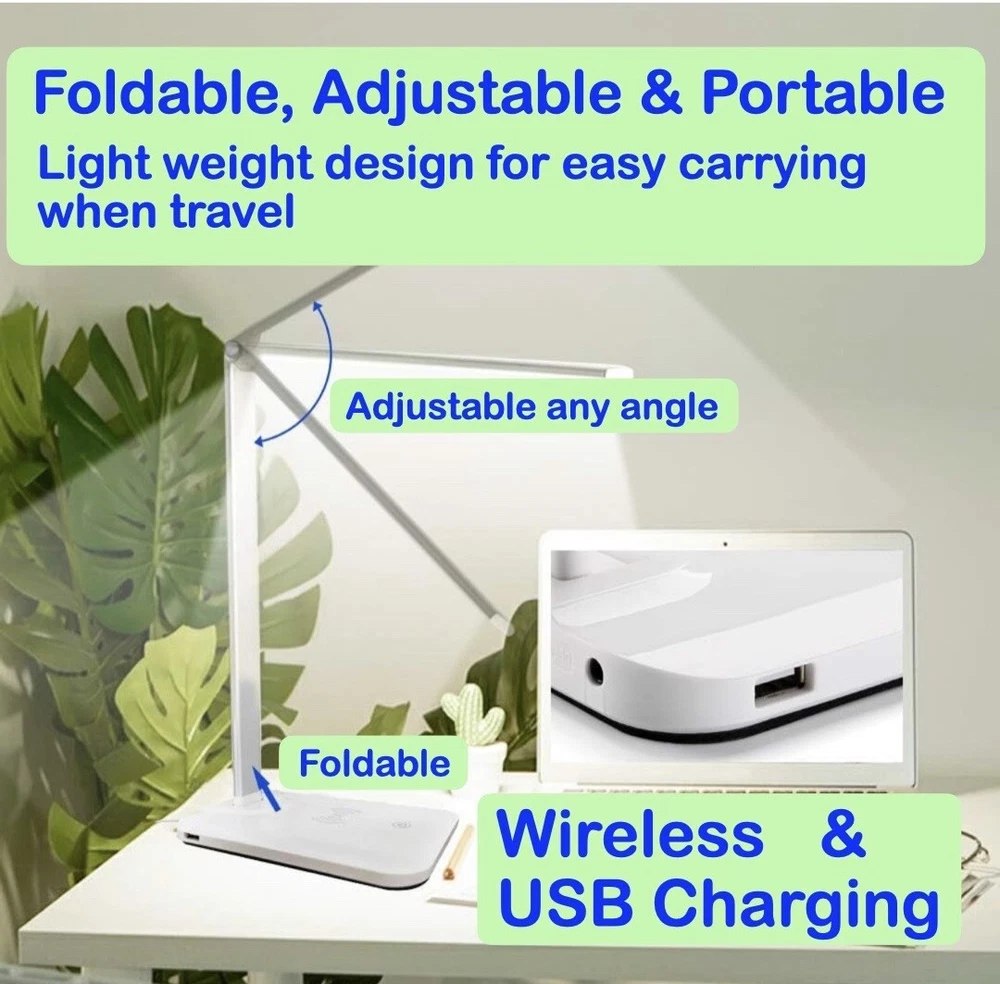 Light weight 3 color dimmable eye-caring LED light,compatible with apple and android wireless charging smartphones, it comes with additional USB port, fully adjustable,foldable for easy carrying. Dimmable 3 color lighting modes: white, soft white and mixed.