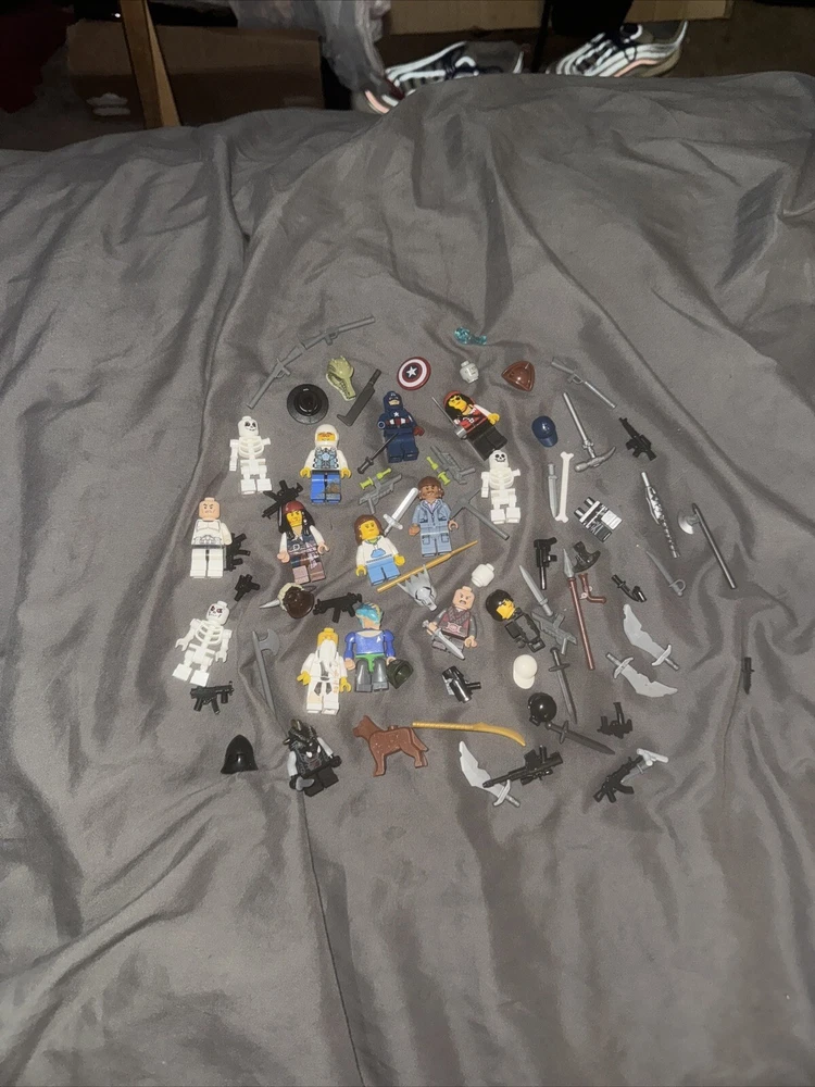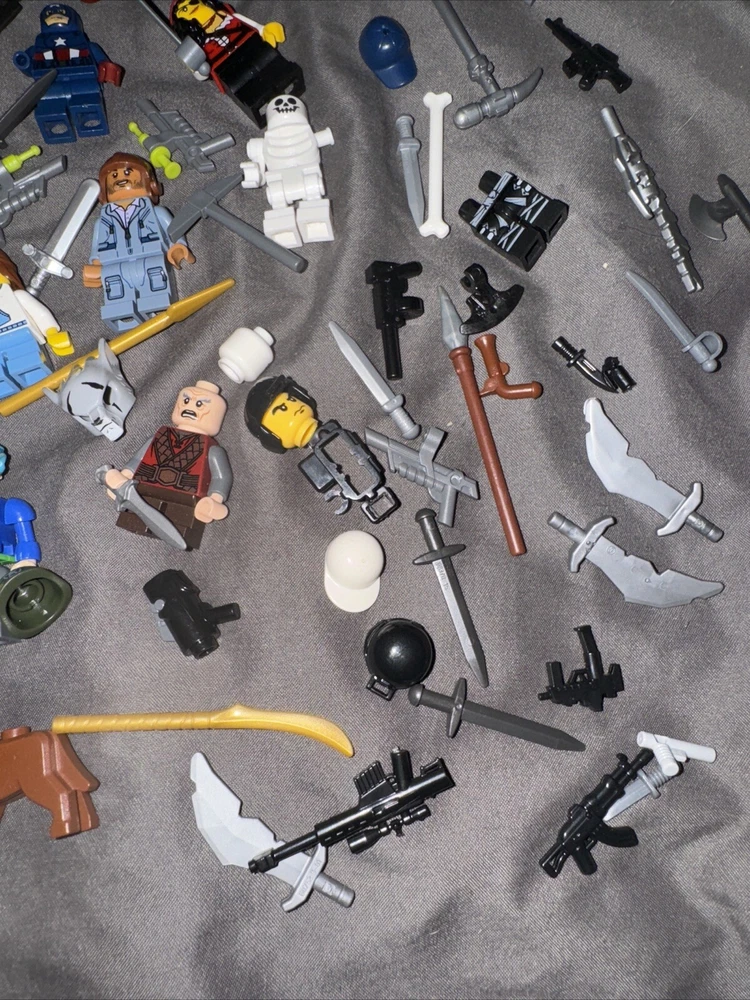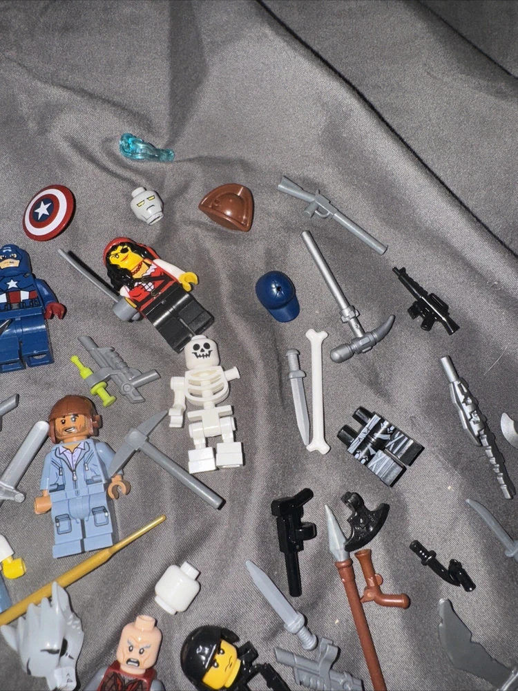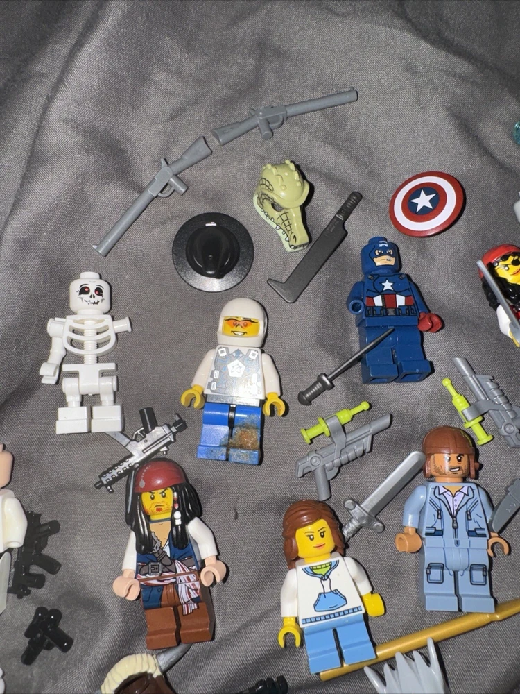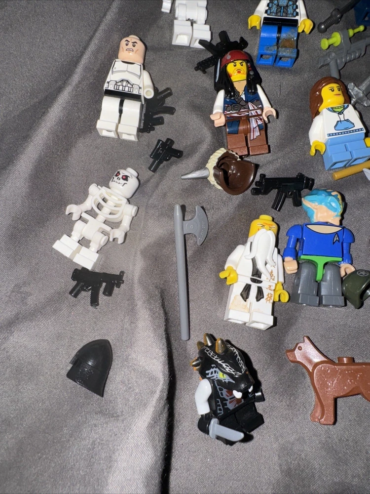13 minifigures pirates of the Caribbean , Jurassic kingdom , Star Trek capt America weapons lot some figs missing pieces