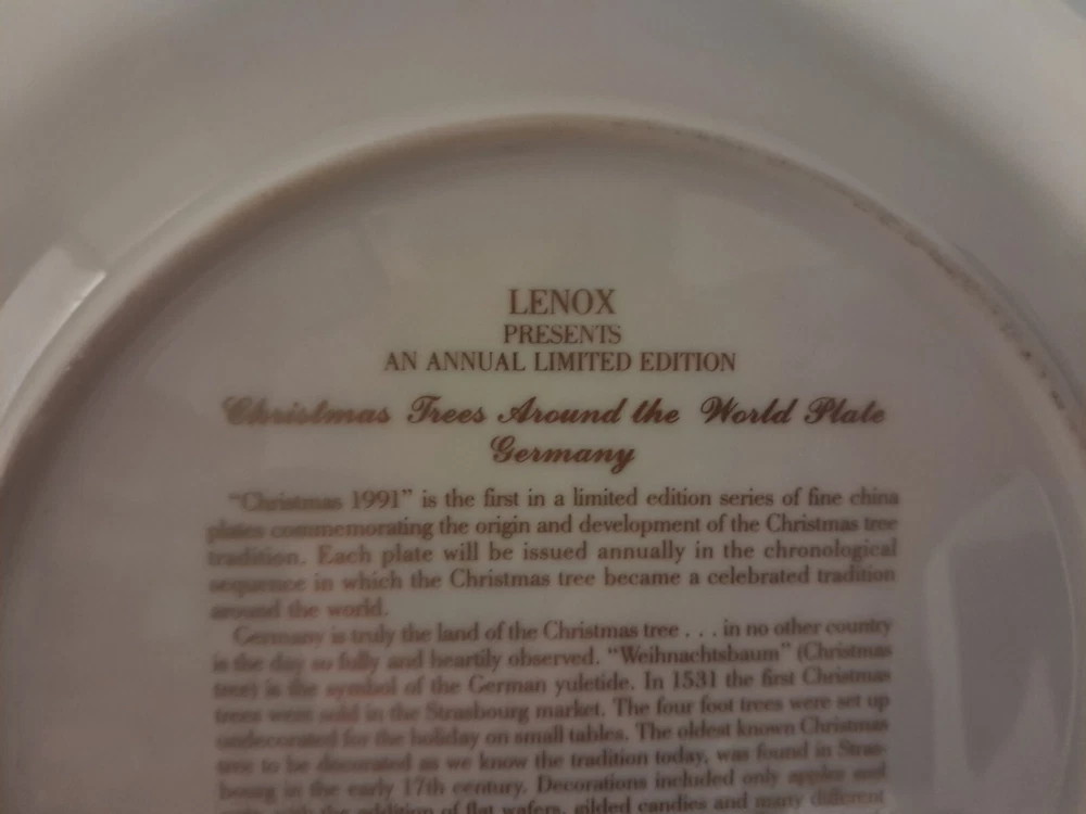 Good pre-owned condition. Lenox 1991 Christmas Trees Around the World plate. Featuring Germany. Gold rimmed around the plate. Please inquire if you need the plate measurements. Smoke free, pet friendly home. 111-1