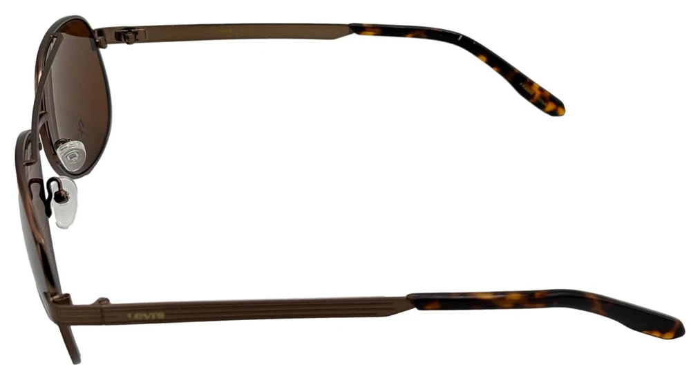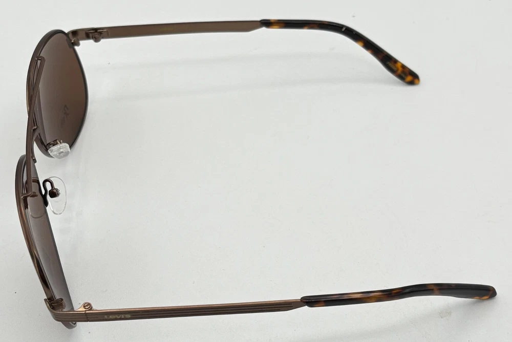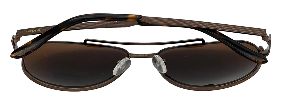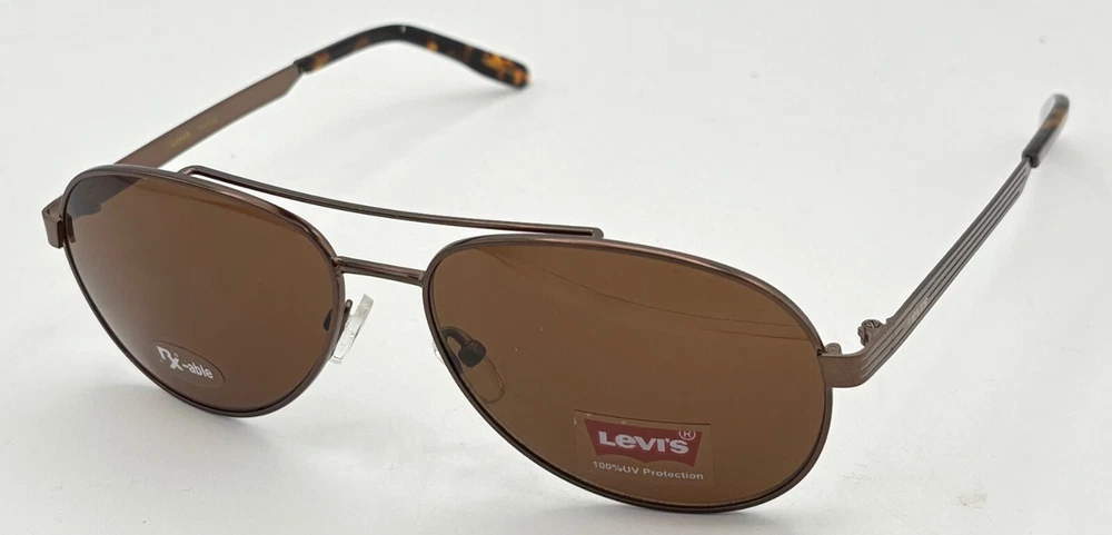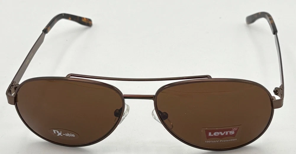 This is brand new Levi Sunglass. , It has full brown plastic temples, Normal retail was about $75.00. Brown Metal Aviator RXable Sunglasses , This comes with a plain black eyewear pouch, Size: 58. 15. 140, Height: 44mm, Tortoise Plastic Temples , Adjustable Plastic Nose Pads , Regular Retail: $75.00 You Pay: $24.99 Brown Gradient Lens, You Pay Only $24.99 Now,