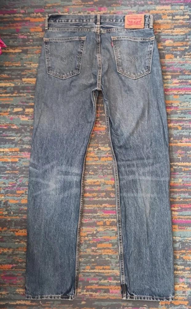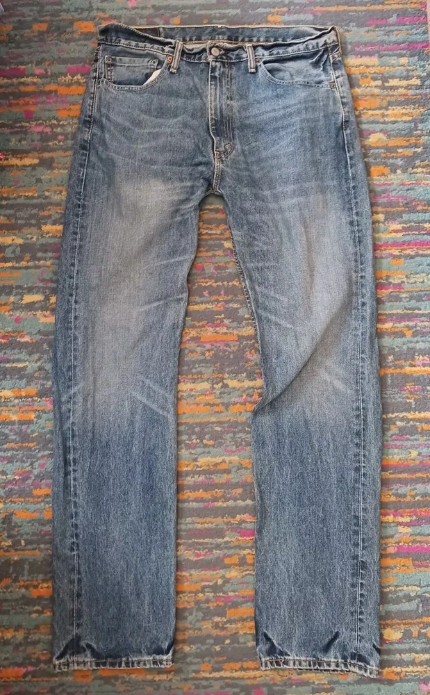 Pre-owned Levi's 505 mens regular straight leg jeans size 36x34 blue denim , has Whiskering, Feathering on back knees & on front. Great condition! Thanks for looking.