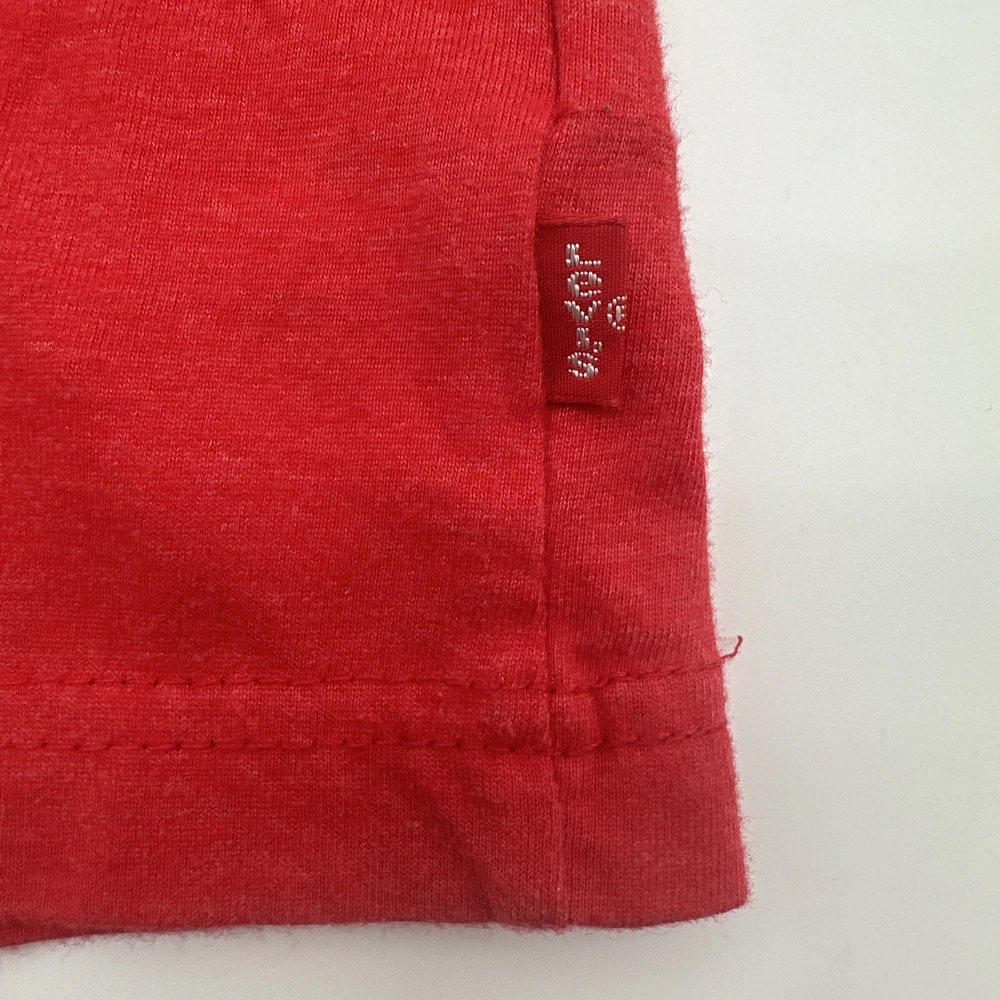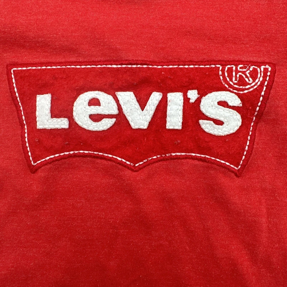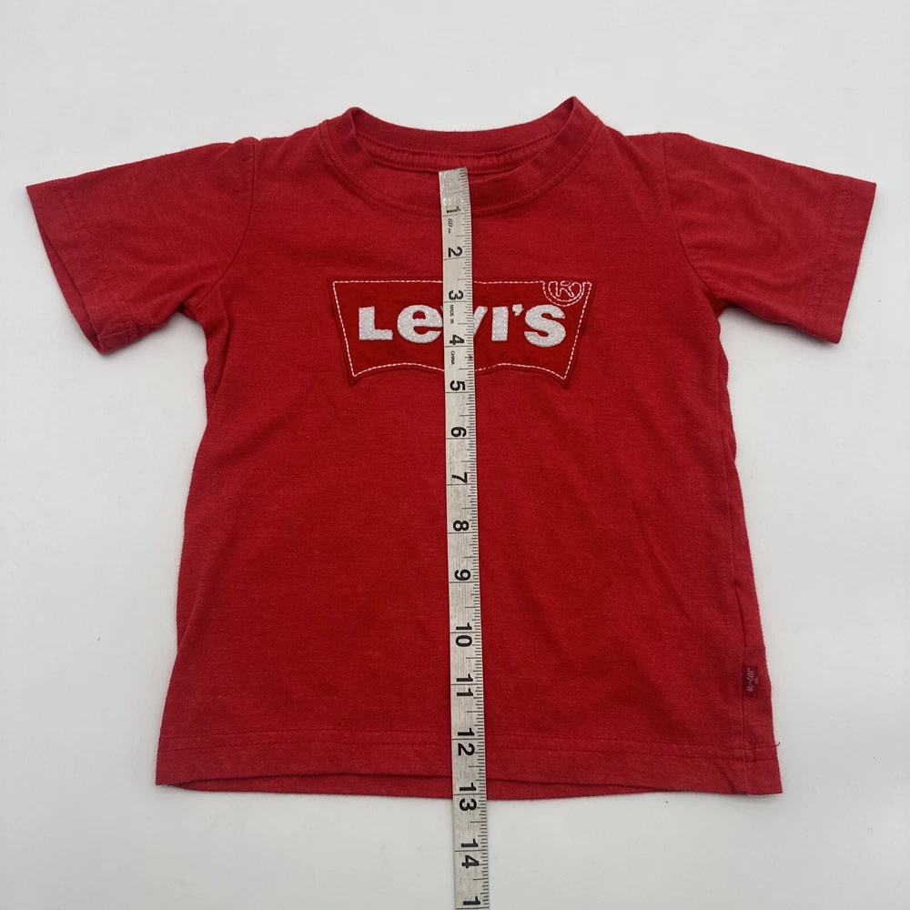 Dress up your little boy in this stylish Levi's T-shirt, featuring a red color with an embroidered logo. The shirt is made of a comfortable blend of polyester and cotton, ensuring a relaxed fit for your child. This short-sleeved crew neck tee is perfect for casual occasions, whether it's a day at the beach or just hanging out. The shirt is available in size 3T, suitable for boys aged 2-3 years. It has a pullover closure and is designed with solid patterns. This T-shirt is a great addition to your child's wardrobe, representing the Levi's brand and style. Check pictures for flaws and measurements