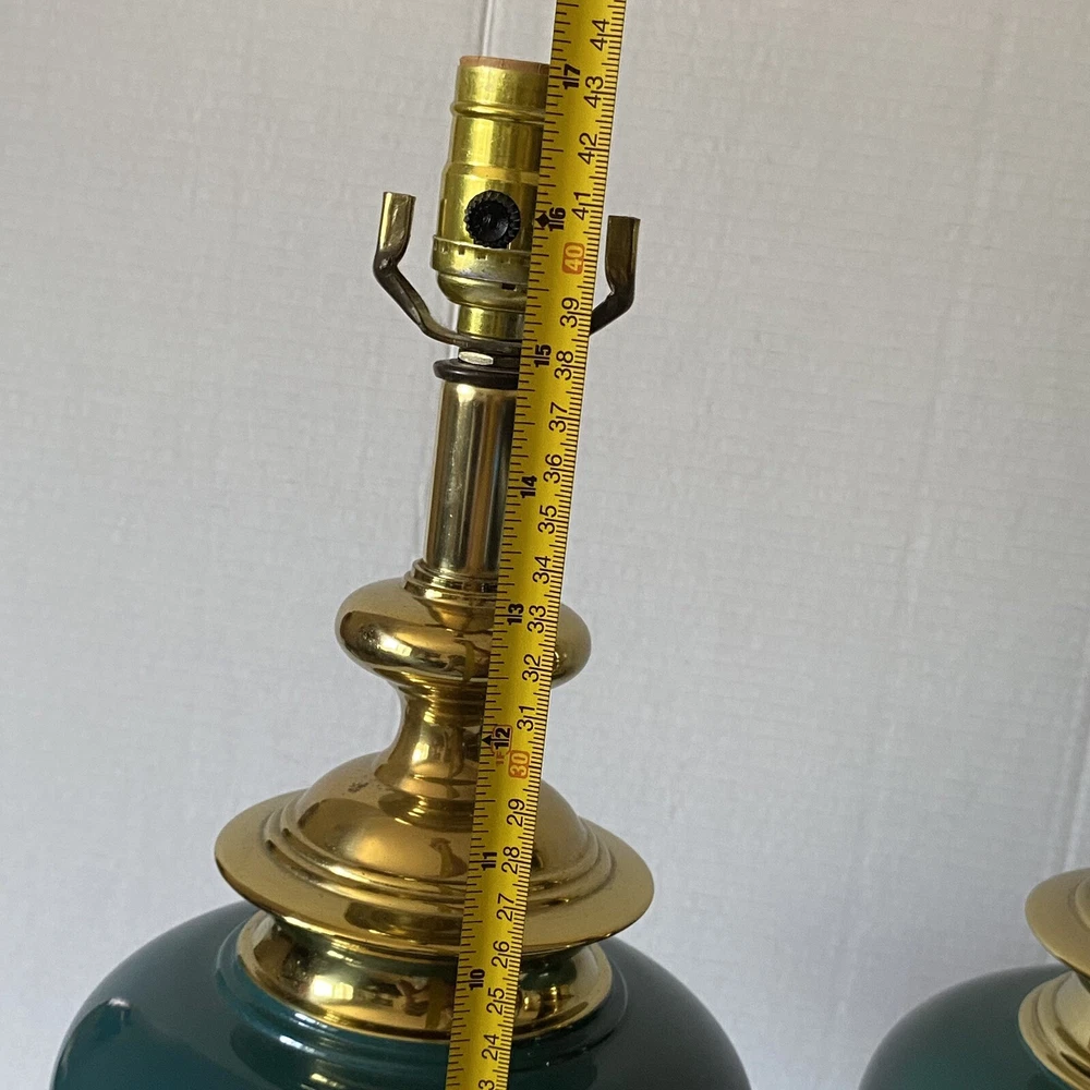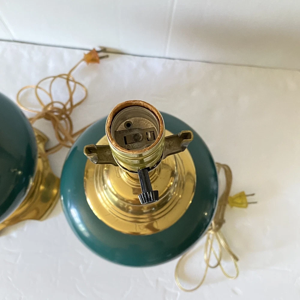Add a touch of vintage charm to your living space with this Leviton Made In USA Big Turquoise Ceramic Brass Table Lamp. Crafted in 1992, this antique piece boasts a solid color pattern and is control by a switch. The lamp is made of brass and glass materials, with a green ceramic finish that gives it a unique appearance. Measuring 17 inches in height and 6.5 inches in width, this table lamp is corded and has a power source that is switch-controlled. The lamp is in the original and authentic Leviton brand, with no shade shape and a vintage style that is perfect for collectors. This piece is a must-have for anyone looking to add a touch of elegance and retro charm to their home decor. They both work good They don’t have the shade They do have wear and cracking on the base but are still very beautiful