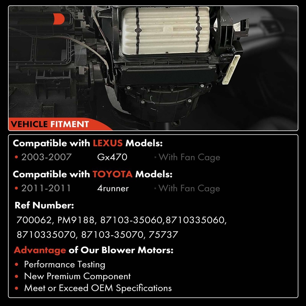 A/C Heater Blower Motor w/Fan Cage for Lexus GX470 Toyota 4Runner 2003 2004-2009 Application: Make Model Year Fan Cage Location Lexus GX470 2003-2007 With Fan Cage Front Toyota 4Runner 2003-2009 With Fan Cage Front Toyota 4Runner 2003-2009 With Fan Cage Front OE Number : 700062, PM9188, 87103-35060, 8710335060, 8710335070, 87103-35070, 75737 Quantity Sold : One Piece Shipping: All orders will be shipped out within 1 business day after payment is cleared. All orders will be shipped out with a tracking number, which will take 2-6 business days for the delivery. We only ship to Paypal confirmed address, please make sure that the address is correct before you check out. Payment: We accept Paypal only for the payment, and all orders should be paid through Ebay auction, please do not pay directly to our Paypal account. Paypal allows to pay by Credit Card, Direct Debit, VISA, eCheck, or other methods, please kindly check Paypal for more information. For multiple purchases, please add items to your Ebay shopping cart and pay once for entire order. Warranty Policy: 30 Days Free Return and Money Back If you are not satisfied with your purchase, you can return the item with original packaging back to us for full refund, not any re-stock fee. The return cost should be paid by buyer. One Year Unlimited Mileage Quality Guarantee If you receive any wrong items, or damage during the transportation or defect items, we will accept the return and pay the return freight. Please noted that the return cost should be prepaid by buyer, we will issue the refund of return cost to buyer after inspecting the faulty item. The full refund or replacement will be available for all faulty items, including the original shipping cost. Please kindly contact us before return, our representatives will send you the detailed return instruction. The guarantee will be only for the cost of the item, we will not responsible for installation or other fees like labor expenses, towing expenses, additional repair expenses or other related expenses.