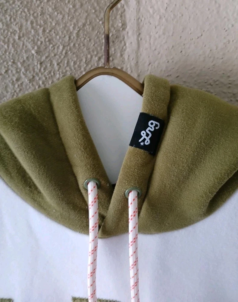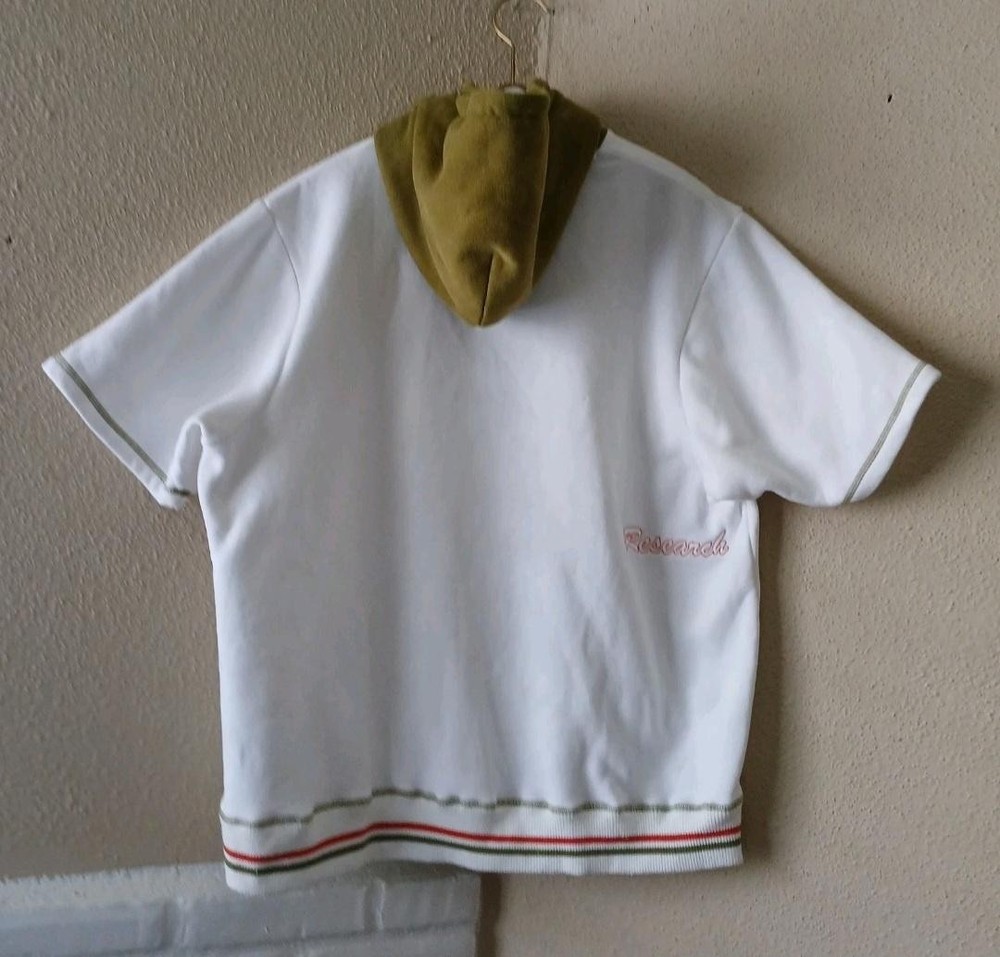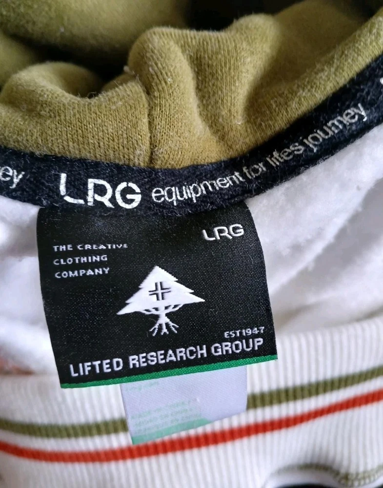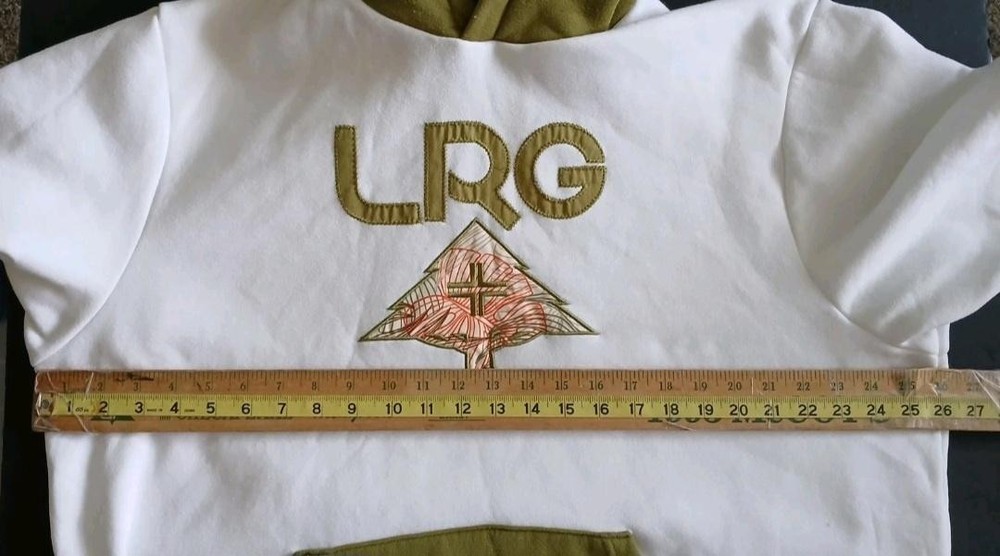 LRG Hoodie Shirt Mens Large White Green Short Sleeve Pullover Tree Graphic Condition: Good, gently worn with very light general wear. No visible stains, holes, or major flaws. Features a unique short sleeve hoodie design with front kangaroo pocket and olive green hood. Large embroidered "LRG" logo with iconic tree and cross graphic on chest. "Research" script on back. Material: 80% cotton, 20% polyester (exclusive of decoration) as shown on interior tag. Striped trim at hem and cuffs for added style. Drawstring hood with white and pink rope cord. Official Lifted Research Group branding throughout: main chest embroidery, inside neckline tag, and specialty woven label on pocket. Tag size: Large. Approximate pit-to-pit measurement is 24.5 inches (see photo for ruler reference). Main colors: White with olive green accents and multicolor embroidery. Made in China according to inner tag.