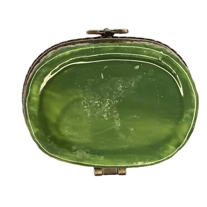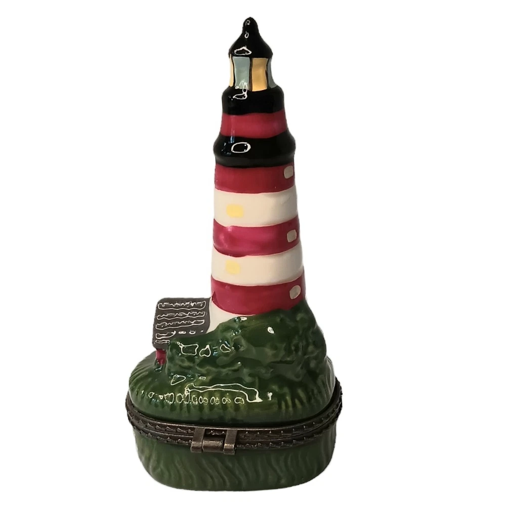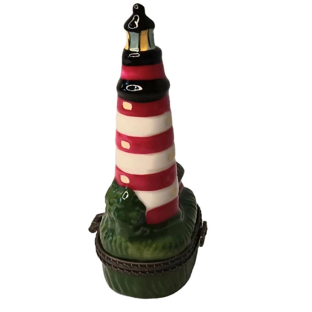 Vintage Porcelain Hinged Lighthouse Trinket Box Red, White and Green Approximately 3.5" x 1.5" x 1" Weighs approximately 1.5 ounces Excellent condition