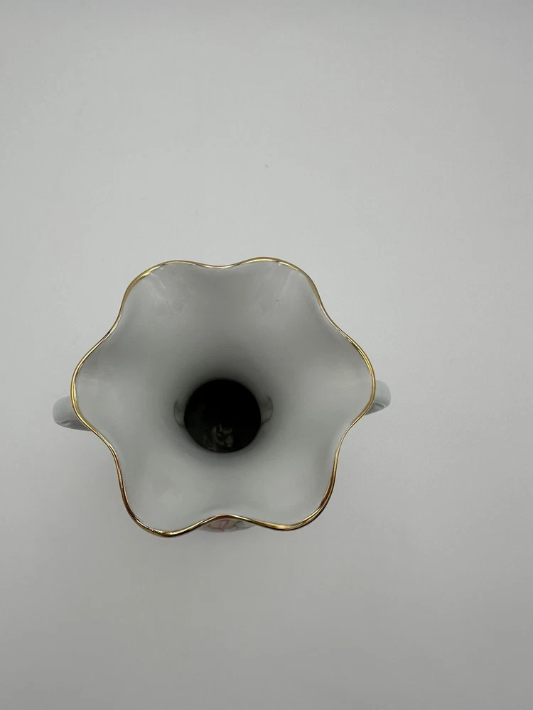 Ruffled Top Gold Trim Bottom protected Two handles Hand Painted Floral Motif Made in France This antique French Limoges vase is a charming addition to any collection. The delicate porcelain material is beautifully hand-painted with a lovely floral design, adding an elegant touch to any room. Made in France, this vase has a timeless style that will never go out of fashion. Perfect for collectors of decorative items, this piece will add a touch of sophistication to any space.