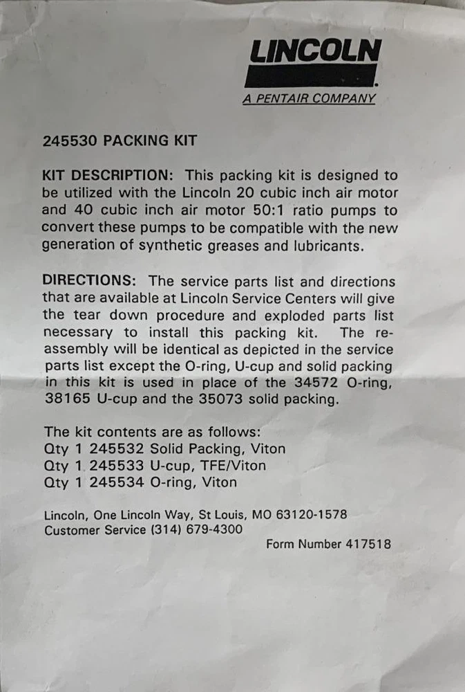JE Lincoln 245530 Synthetic Grease Packing Kit For Air Operated Pump Chassis Click images to enlarge Description This Listing is for a Lincoln Packing Kit Model: 245530 SPECIFICATIONS : Brand: Lincoln Type: Packing Kit Condition: New (1) Solid Packing 245532 (1) U-cup 245533 (1) O-ring 245534 Weight: 5.28 oz This unit is exactly as pictured and fully guaranteed. Pictures sell! Auctiva offers Free Image Hosting and Editing. 300+ Listing Templates! Auctiva gets you noticed! The complete eBay Selling Solution.