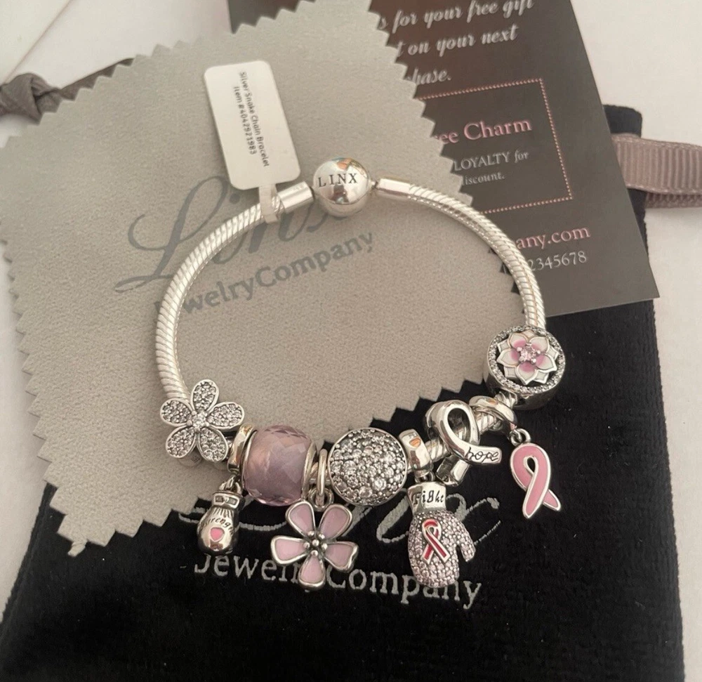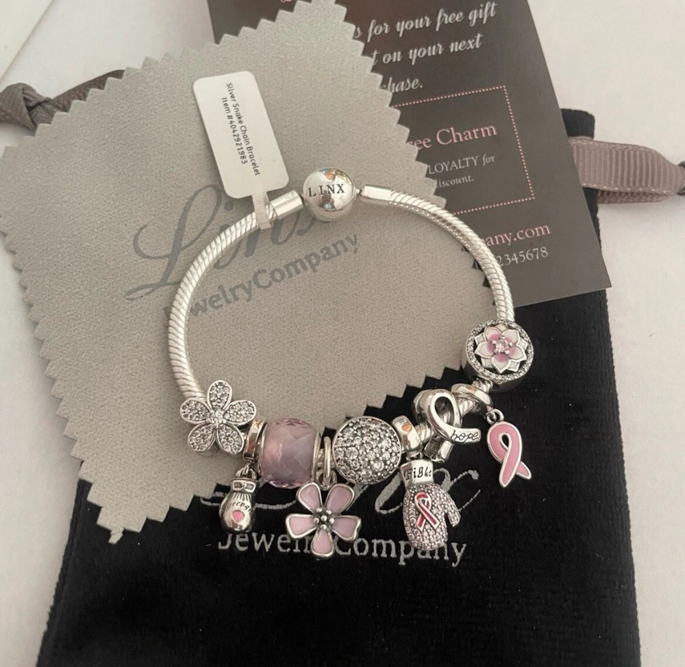 Linx snake chain style charm bracelet in 925 sterling silver, with a ball clasp, featuring the signature Linx logo. This beautiful bracelet features 9 Linx charms also in 925 Sterling silver. Size 7.5 Bracelet is also available in sizes 6.3 (toddler size), 6.7, 7.1, 7.9, and 8.3. Should you require one of these sizes, please message us prior to purchasing and we will create a listing for you in your requested size. Please remember to add an additional inch to the measurement of your wrist in order to allow room for your charms, as the charms will cause the bracelet to fit a bit tighter. Bracelet is new with tags and will also come with the original Linx velvet jewelry pouch, and Linx sterling silver polishing cloth.
