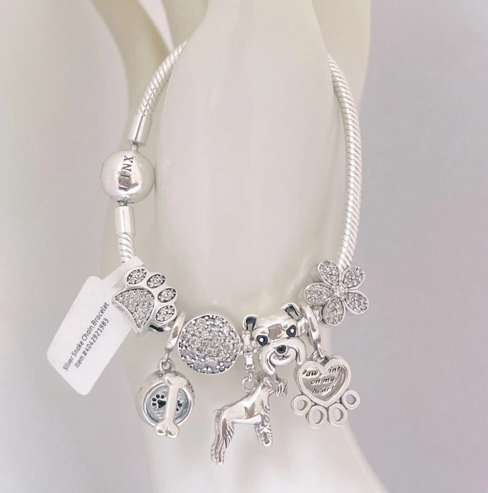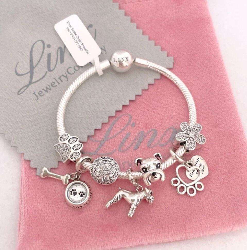 Linx snake chain style charm bracelet in 925 sterling silver, with a ball clasp, featuring the signature Linx logo. This beautiful bracelet features 7 Linx charms also in 925 Sterling silver. Size 7.5 Bracelet is also available in sizes 6.3 (toddler size), 6.7, 7.1, 7.9, and 8.3. Should you require one of these sizes, please message us prior to purchasing and we will create a listing for you in your requested size. Please remember to add an additional inch to the measurement of your wrist in order to allow room for your charms, as the charms will cause the bracelet to fit a bit tighter. Bracelet is new with tags and will also come with the original Linx velvet jewelry pouch, and Linx sterling silver polishing cloth.
