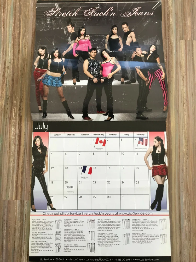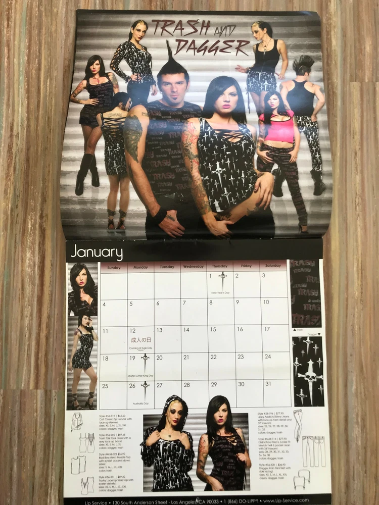 Lip Service 2009 merchant/trade calendar has modeled pictures of the 2009 clothing line. Calendar is in used condition and has creasing/bends, the page for June has a tear along the top edge. 12" x 12". The pictures show the actual calendar that you will receive. Ships from Alberta, Canada. Tax applies to purchases. Ships via tracked mail. (FB)