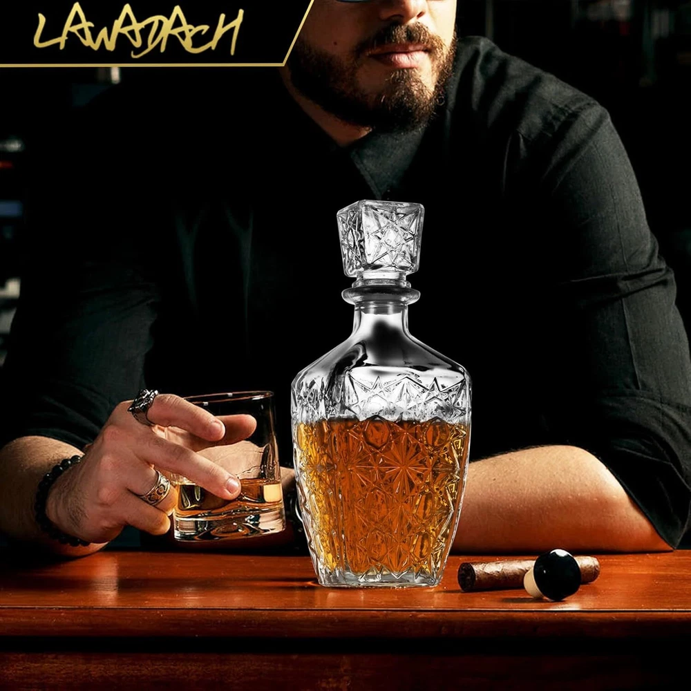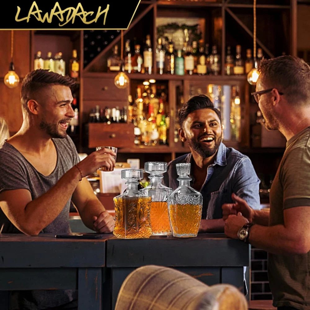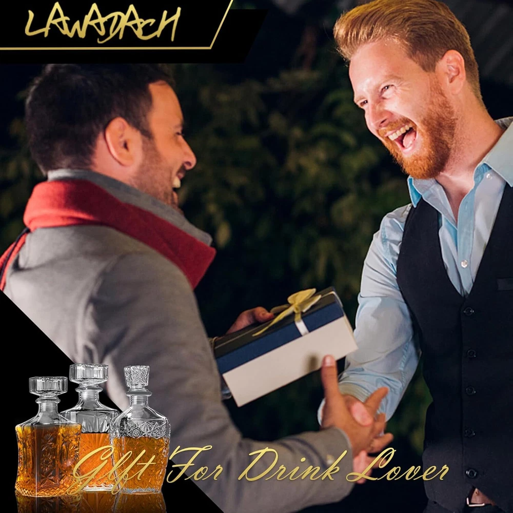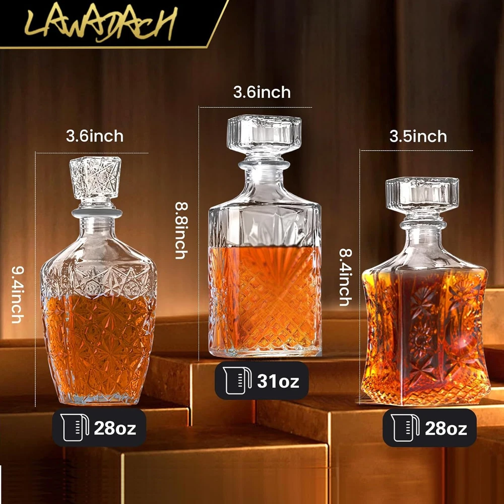 3 Different Design - LAWADACH decanter set includes one 31oz and two 28oz glass bottles with different patterns. They are the ideal size for storing your favorite beverages, such as whiskey, tequila, brandy, and scotch. Airtight Seal - To ensure your drinks stay fresh for longer periods, the airtight seal stopper allows you to enjoy a smooth and rich drinking experience every time. Premium Quality - The decanter set is made from high-quality glass, ensuring durability and elegance. The perfect way to display and pour your favorite beverages with sophistication. Perfect Gift Idea - Our decanters make great gifts for any occasion, including weddings, birthdays, and anniversaries. They are thoughtful and unique presents that will be appreciated by any beverage connoisseur. After Sales Guarantee - If you have any dissatisfaction after receiving the decanters, please contact us. We will reply within 24 hours and provide you with a solution that satisfies you 100%. Product Description LAWADACH Decanters 28oz 2 & 31oz 1, Your Perfect Beverage Partner Serve your favorite whiskey, scotch, bourbon, or other drinks in style with our elegant decanter. Our decanter is crafted from high-quality crystal glass, ensuring both durability and style. The airtight seal ensures that your drink stays fresh for longer periods of time, allowing you to enjoy a smooth and rich experience every time. LAWADACH, Master of Decanters, Your Perfect Beverage Partner Owning a product R&D team and customer support team, LAWADACH is a trusted brand specializing in decanters. The products we offer are carefully selected and crafted from premium materials. The Best Decanters from LAWADACH 3 different glass bottles allow you to store various drinks and enjoy a variety of flavors! Add charm to your parties with these decanters. Classic designs suited for different occasions. Whether you're serving whiskey, brandy, vodka, bourbon, or other drinks, our bottles will help you create memorable moments. Package Includes: 3 Glass Decanters (28oz 2 & 31oz 1) Wide Application These decanters are perfect for use in various settings, whether it's a dining table, bar, wine cabinet, courtyard, kitchen, bedroom, or study. They bring charm to your gatherings and ensure you can enjoy great drinks anytime, anywhere.