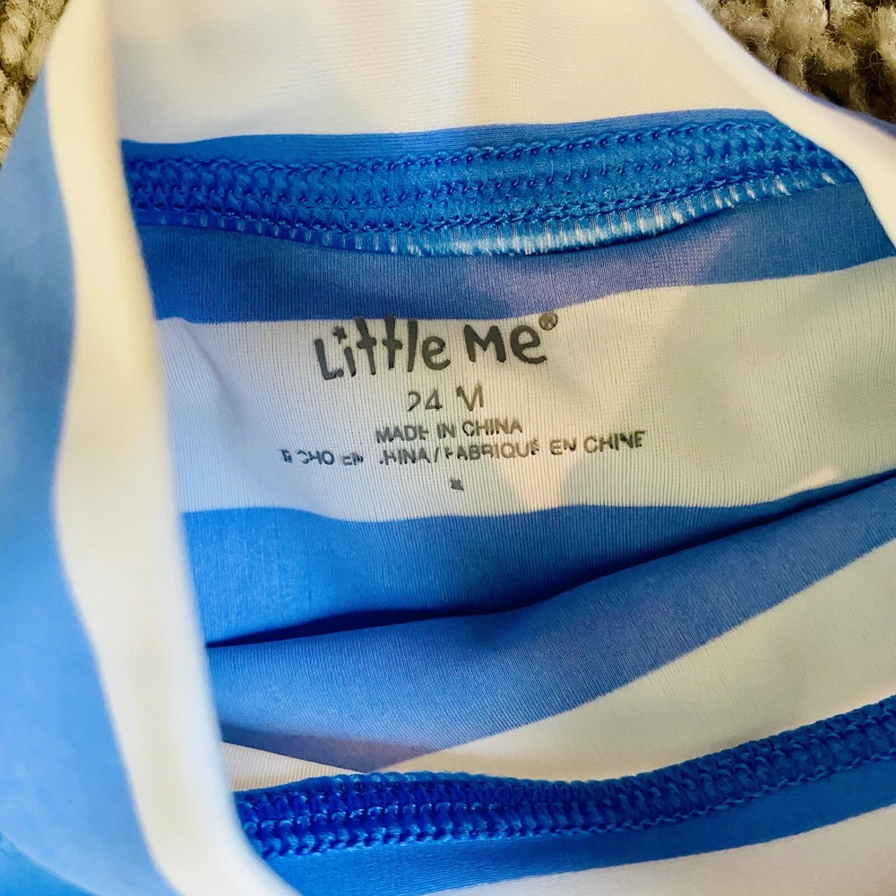 Make a splash with this adorable Little Me Toddler Boy Swim Set. The two-piece set includes a blue, white, and red striped rash guard with long sleeves and a fun crab theme, paired with matching trunks. Perfect for beach days or pool parties, this swim set is sure to keep your little one looking cute and feeling comfortable. Available in size 24 months, this swim set is brand new and ready for some summer fun.