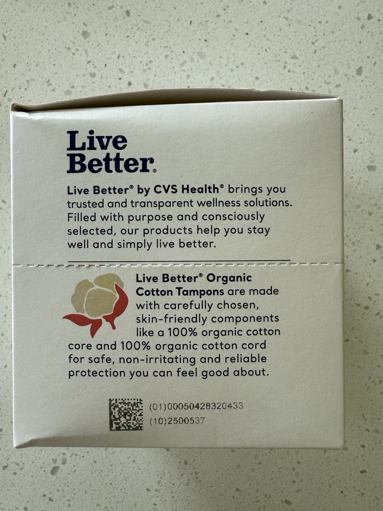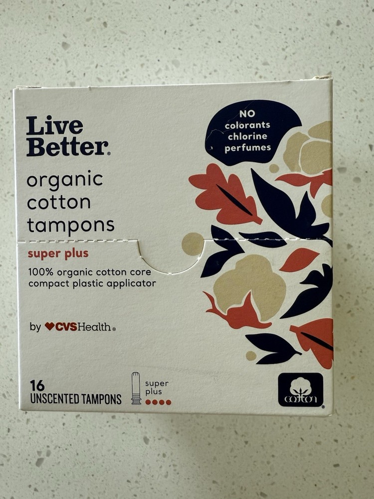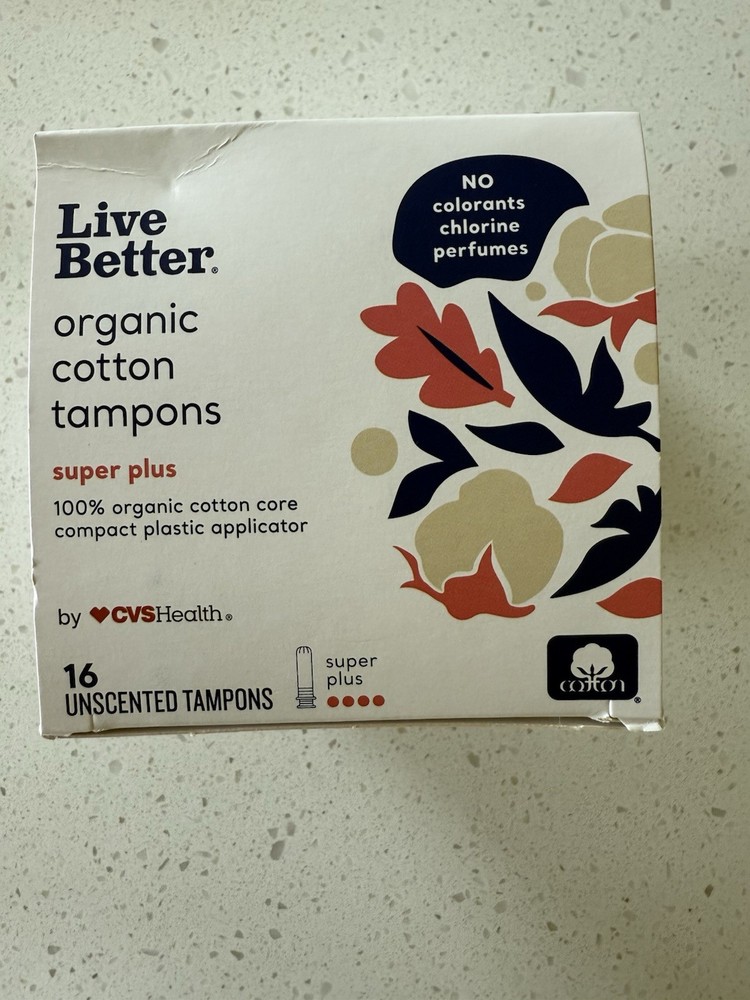 Live Better Organic Cotton Tampons Super Flow 16 Count. There are 2 boxes with 16 in each box. Boxes unopened. From a smoke free home.