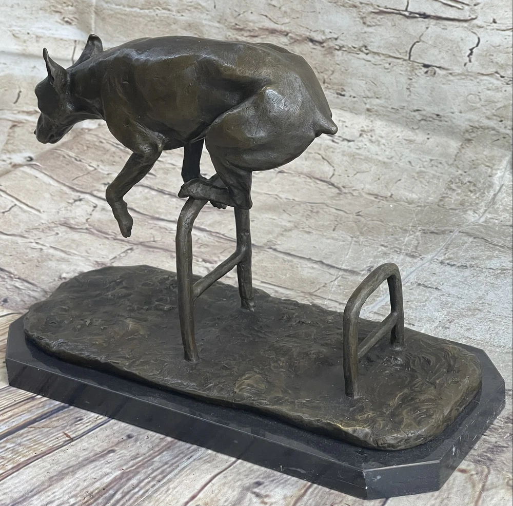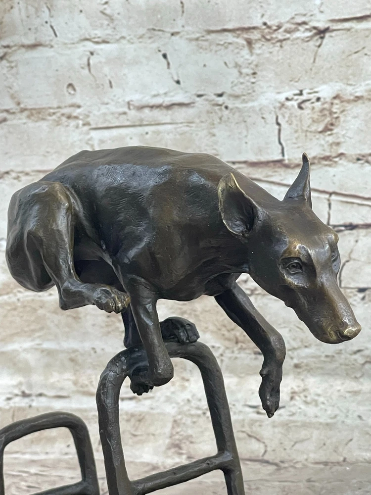 Living Bronze Doberman Pinscher Dog cast bronze statue on marble base 1994 Art Living Bronze Doberman Pinscher Dog cast bronze statue on marble base 1994 Art Condition : This sculpture is in perfect condition. Bronze Dimensions with Marble Base: Height 9" X Length 12" Marble Dimensions: 12"X 6" Height without base: 8.5" Weight: 12 LBS Inventory: 9440K13049 This high-energy dog leaps over hurdles with remarkable skill and vivacity, showcasing its talent and adventurous spirit. Crafted in bronze patina, this sculpture captures the essence of a jumping dog with exquisite details that bring out the dog's elegance and charm. The piece, signed by the artist Milo, depicts the dog gazing intently ahead, capturing a moment of pure athleticism and grace. The statuesque pose of this magnificent creature exudes aristocratic charm and grace. The intricate details of the sculpture, from the texture of the dog's fur to the muscular definition of its body, showcase the artist's dedication to capturing the true spirit of these animals. The warm brown patina finish adds depth and character to the artwork, making it a captivating addition to any space. Whether you're a dog lover, an art enthusiast, or simply appreciate the beauty of nature's creatures, this jumping dog bronze sculpture is a stunning representation of agility and elegance. Display it in your home, office, or gallery to celebrate the athleticism and grace of man's best friend. Shipping Terms : Most of our items are shipped via USPS (United States Postal Service) mail or UPS. Most orders are shipped within 24-48 hours of purchase. Please be aware that not all items are available for USPS shipping due to size and weight. We do ship to Hawaii, Alaska, Canada, Puerto Rico, APO/AE, and U.S. Virgin Islands, however, an additional charge may be required. Please contact us before making any purchases in these areas. For Non-USA customers, you may be responsible for all duty, tax, brokerage fees that may be due upon delivery (shipping costs cover freight charges only). We also ship internationally. Please refer to the "Shipping and Handling" chart for the rates for each area. Payment : We accept just about any form of payment. PayPal, Master Card, Visa or American Express credit cards. Money orders, cashiers checks, and even personal or business checks. For governmental institutions, we will also accept a purchase order. Please understand that for personal or business checks we have to wait for the check to clear (usually 7 days) before shipping. Condition : New Detailed Hand Crafted Hot Cast Bronze Satisfaction Guaranteed. This is Stock Photo, Slight Color Variation!! Listing and template services provided by inkFrog