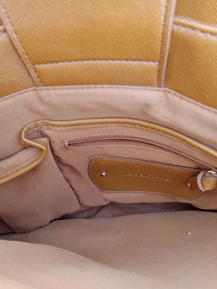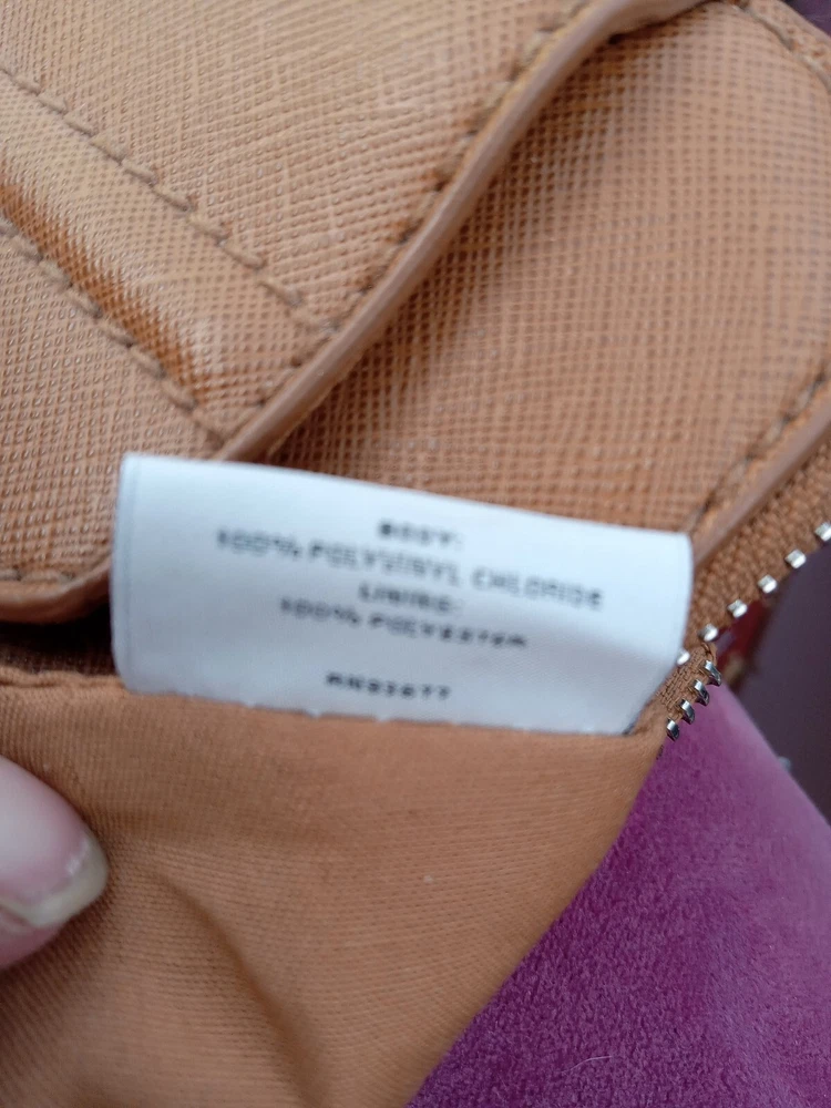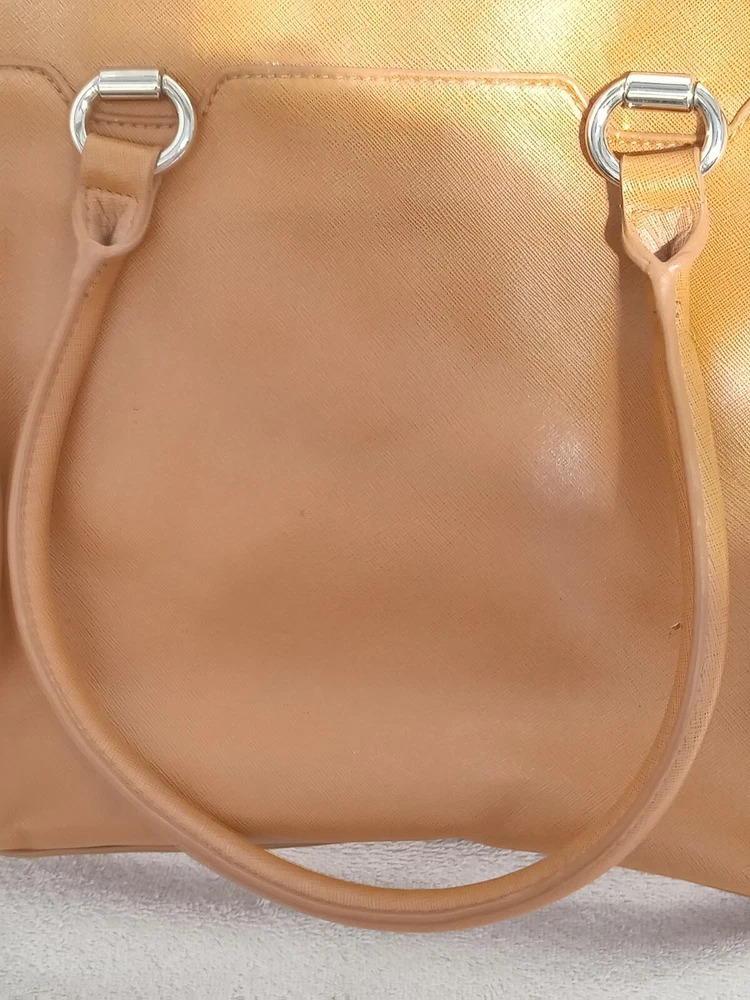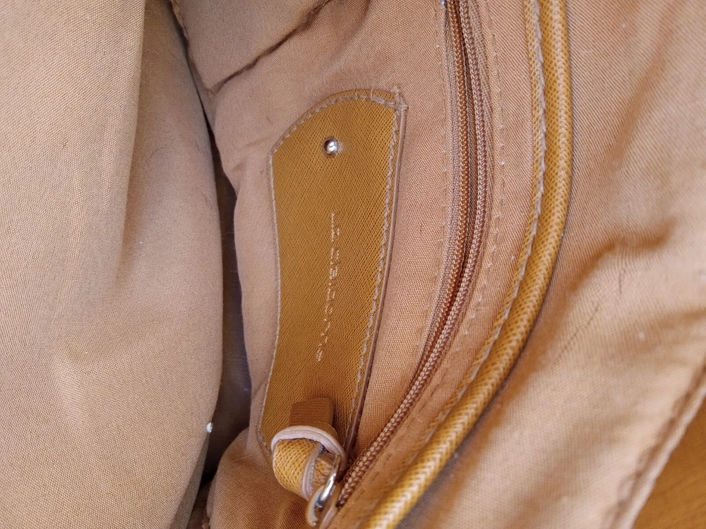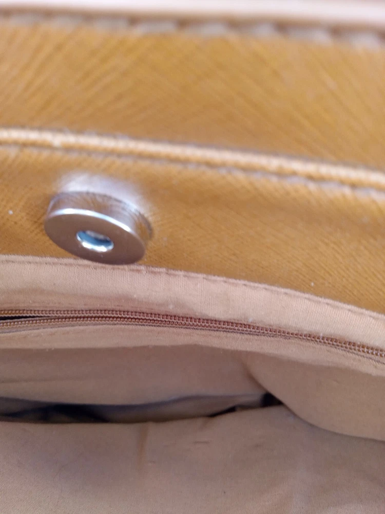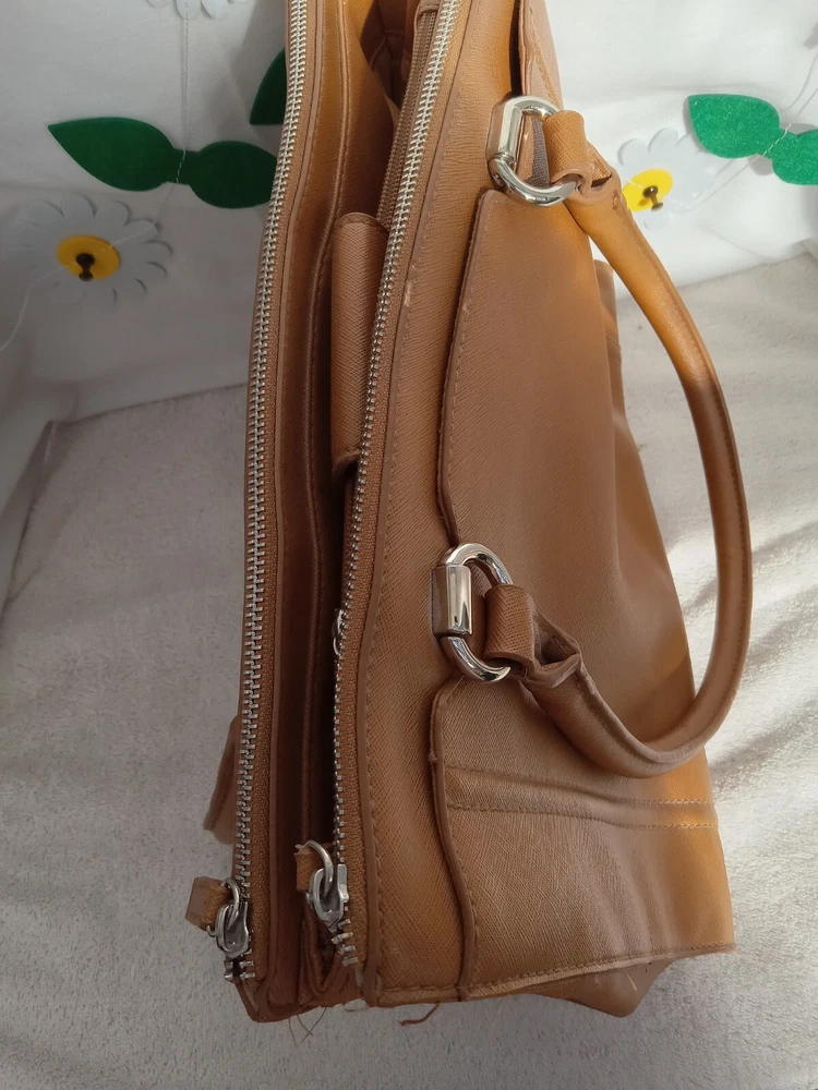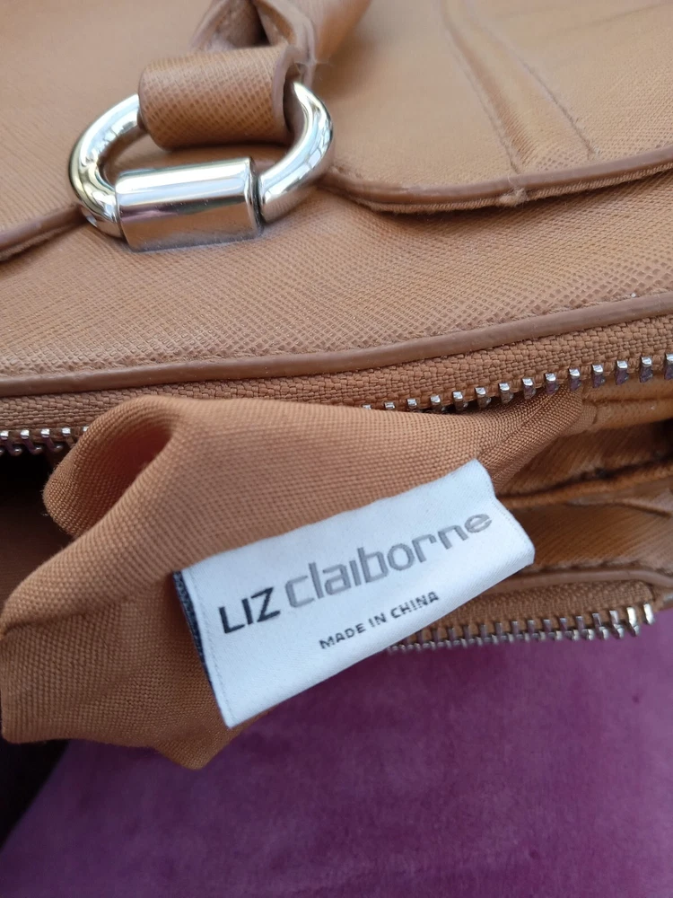 Really great bag in good condition. One small scrape shown in picture. This is a large bag 14 in wide 11 in tall opens up to 5 1/2 in and is 14 in deep. Lots of compartments for just about anything. Lining is 100% polyester. Has 3 top zipper pockets, 1 inside zipper pocket 3 pouch type pockets on the inside and a slid in pocket on the outside. Closed buckle loops hold the handle metal in a gold tone. Magnetic snap close. Lots of space great bag for work or day trip. No rips holes fraying.