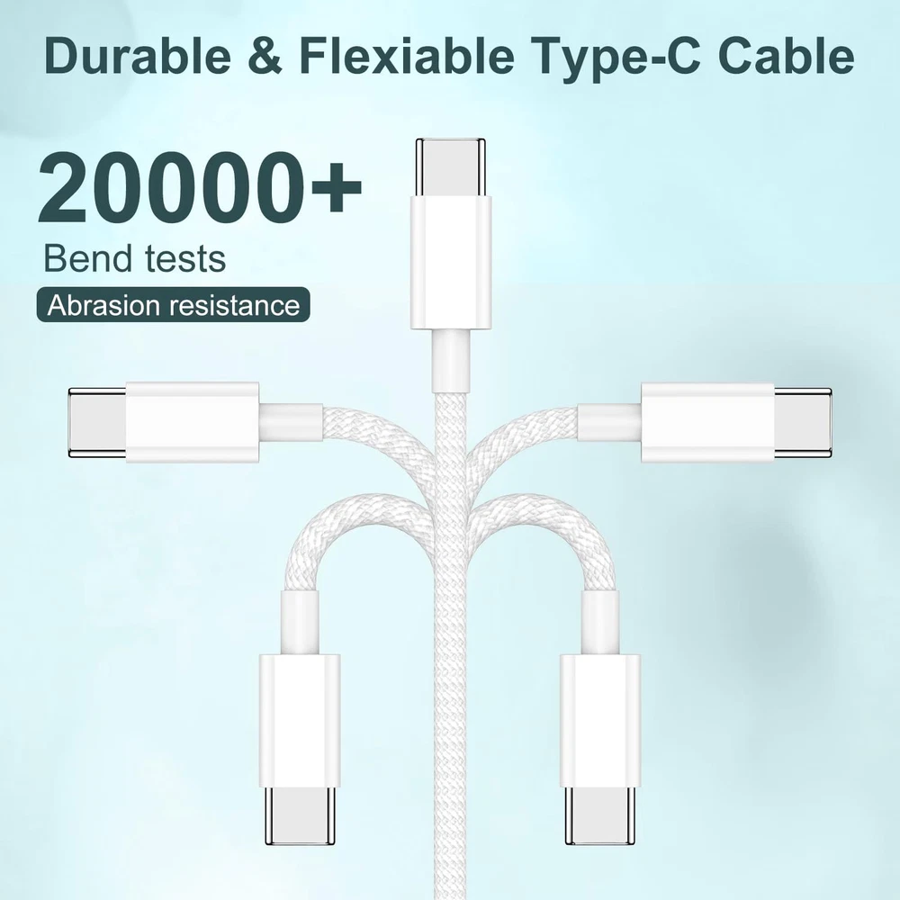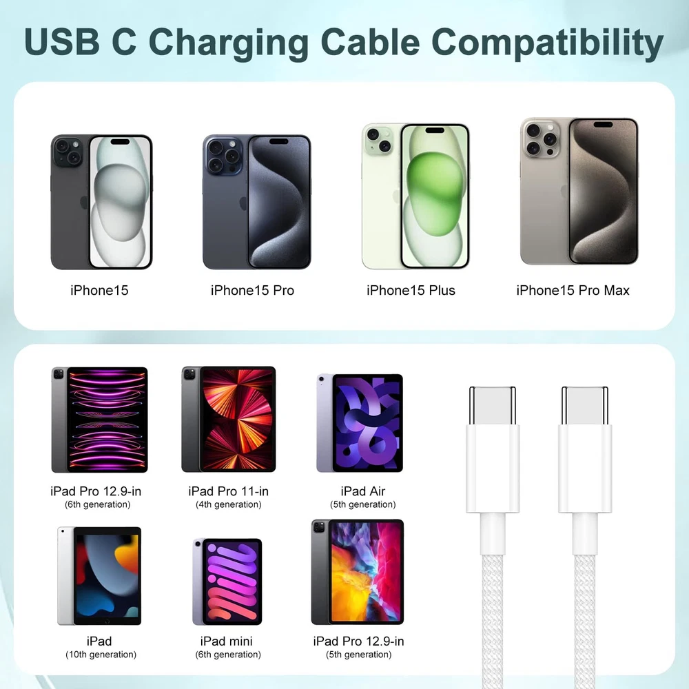 Long USB C to C Fast Charging Cable 10ft, 60W Type C to C Charger Cord for Apple iPhone 15 Plus/15 Pro Max, MacBook Pro 2021/2020/2019/2018,iPad 12.9/11 inch/Mini/Air 5/4,Samsung Galaxy S23+/S23 Ultra 【iPhone 15 60W Fast Charging cable】This iphone 15 pro usb c to type c cable support PD3.0/QC3.0/QC4.0 fast charging up to 60W charging. suit with USB-C adapters such as 18W/30W/45W/60W. charges iPhone 15,USB C Phone from to 60% within about 35 minutes, Improve iPhone 15 series charging efficiency and save time. and data transfer speeds up to 480Mbps (200 songs synced per minute) compatible with iPhone 15,Samsung,iPad Air Mini Pro,Macbook and More. 【many Protection USB C Port】USB to USB C Cable has electronic safety certifications that comply with appropriate standards, it built-in laser welding technology, which ensure the metal part won't break. which increases charging speed. Overheating and overcharging protection function to ensure the safety of you and your devi ce while syncing and charging.The copper core part is reinforced with UV glue to prevent the solder joints from falling off. 【Durable and Stable】Premium Nylon materials adding additional durability and tangle-free, can bear 20000+ bending test. Strong military fiber make it flexible.Unique laser welding technology make the connector prevent from broken.The USB C port through Load-bearing about 13KG test which longer service life and will break.Unique insulation and shielding allows for easier and safer charging and syncing. 【Right for ALL Your USB C Devices】This is the USB-C to USB-C cable Not the USB-C to USB-A cable, Compatible with virtually all USB-C devices including phones, tablets, and laptops. Such as iPhone 15/15 Plus/15 Pro/15 Pro Max, Samsung Galaxy S23/S22/S21+/S21/S20/ S20+/ S20 Ultra/ Note 10, MacBook Air/Pro 13'', iPad Pro 12.9-in.(6th ),iPad Pro 11-in.(4th ),iPad Air (5th ),iPad (10th generation),iPad mini (6th ) and more. 【What you get】2 pieces iPhone 15 USB C cables,If you have any questions about our iPhone cable, please feel free to contact us. We will give you a satisfactory answer to prove our emphasis on quality. You can buy with confidence. 【iPhone 15 60W Fast Charging cable】This iphone 15 pro usb c to type c cable support PD3.0/QC3.0/QC4.0 fast charging up to 60W charging. suit with USB-C adapters such as 18W/30W/45W/60W. charges iPhone 15,USB C Phone from to 60% within about 35 minutes, Improve iPhone 15 series charging efficiency and save time. and data transfer speeds up to 480Mbps (200 songs synced per minute) compatible with iPhone 15,Samsung,iPad Air Mini Pro,Macbook and More. 【many Protection USB C Port】USB to USB C Cable has electronic safety certifications that comply with appropriate standards, it built-in laser welding technology, which ensure the metal part won't break. which increases charging speed. Overheating and overcharging protection function to ensure the safety of you and your devi ce while syncing and charging.The copper core part is reinforced with UV glue to prevent the solder joints from falling off. 【Durable and Stable】Premium Nylon materials adding additional durability and tangle-free, can bear 20000+ bending test. Strong military fiber make it flexible.Unique laser welding technology make the connector prevent from broken.The USB C port through Load-bearing about 13KG test which longer service life and will break.Unique insulation and shielding allows for easier and safer charging and syncing. 【Right for ALL Your USB C Devices】This is the USB-C to USB-C cable Not the USB-C to USB-A cable, Compatible with virtually all USB-C devices including phones, tablets, and laptops. Such as iPhone 15/15 Plus/15 Pro/15 Pro Max, Samsung Galaxy S23/S22/S21+/S21/S20/ S20+/ S20 Ultra/ Note 10, MacBook Air/Pro 13'', iPad Pro 12.9-in.(6th ),iPad Pro 11-in.(4th ),iPad Air (5th ),iPad (10th generation),iPad mini (6th ) and more. 【What you get】2 pieces iPhone 15 USB C cables,If you have any questions about our iPhone cable, please feel free to contact us. We will give you a satisfactory answer to prove our emphasis on quality. You can buy with confidence. Shipping from the USA All of our products are shipped from the USA, ensuring quick delivery to your destination. Payment We offer the following payment methods: PayPal, credit card, bank transfer, and eBay's secure payment system. Free Shipping & Free Returns Shipping within the USA is FREE. Additionally, any return is absolutely free for you. Risk-Free Purchase You have the option to return an item within 30 days without any justification. We cover the return shipping costs! Fast Shipping We ship immediately upon receipt of payment. Generally, the package is delivered within 2-3 days in the USA. If it takes longer, we will contact you. Quality and Costs Made in Europe, USA, China No customs fees or additional charges Total satisfaction guarantee Invoice with declared VAT available upon request in .pdf format Feedback Your feedback is very important to us. After you pay for your purchase, you will automatically receive positive feedback from us.