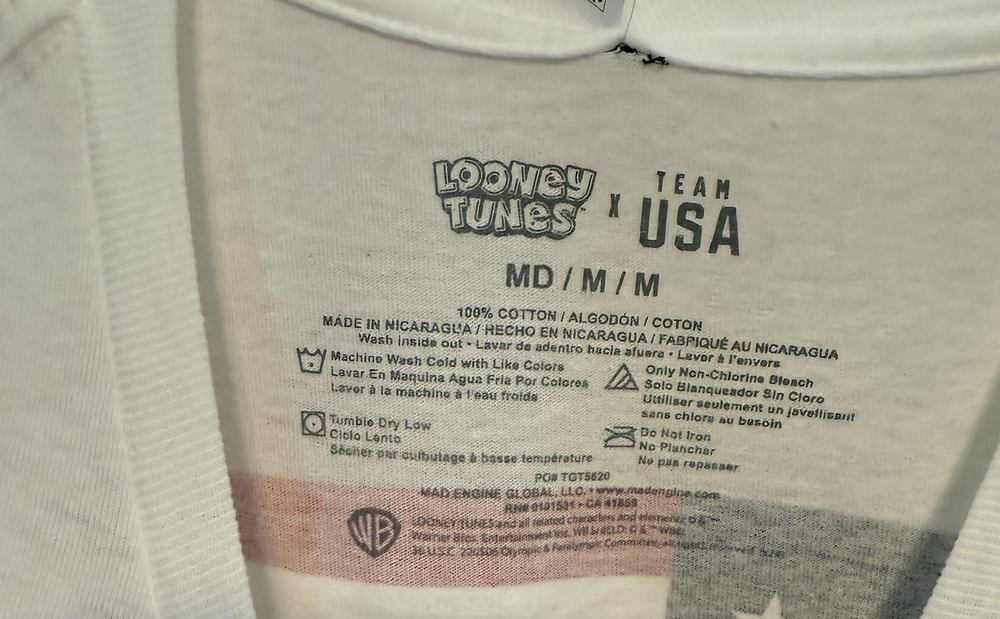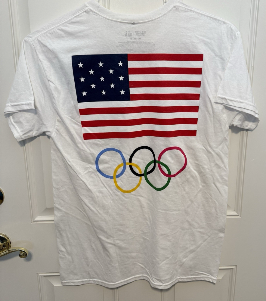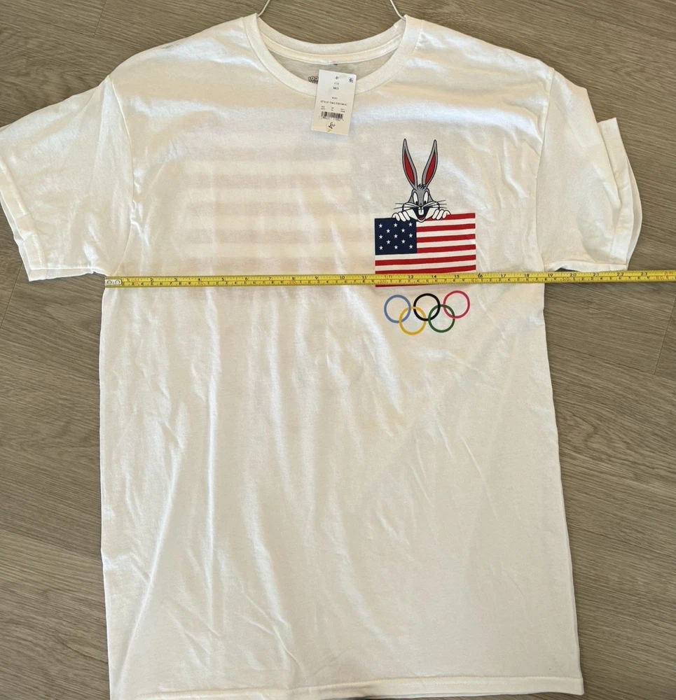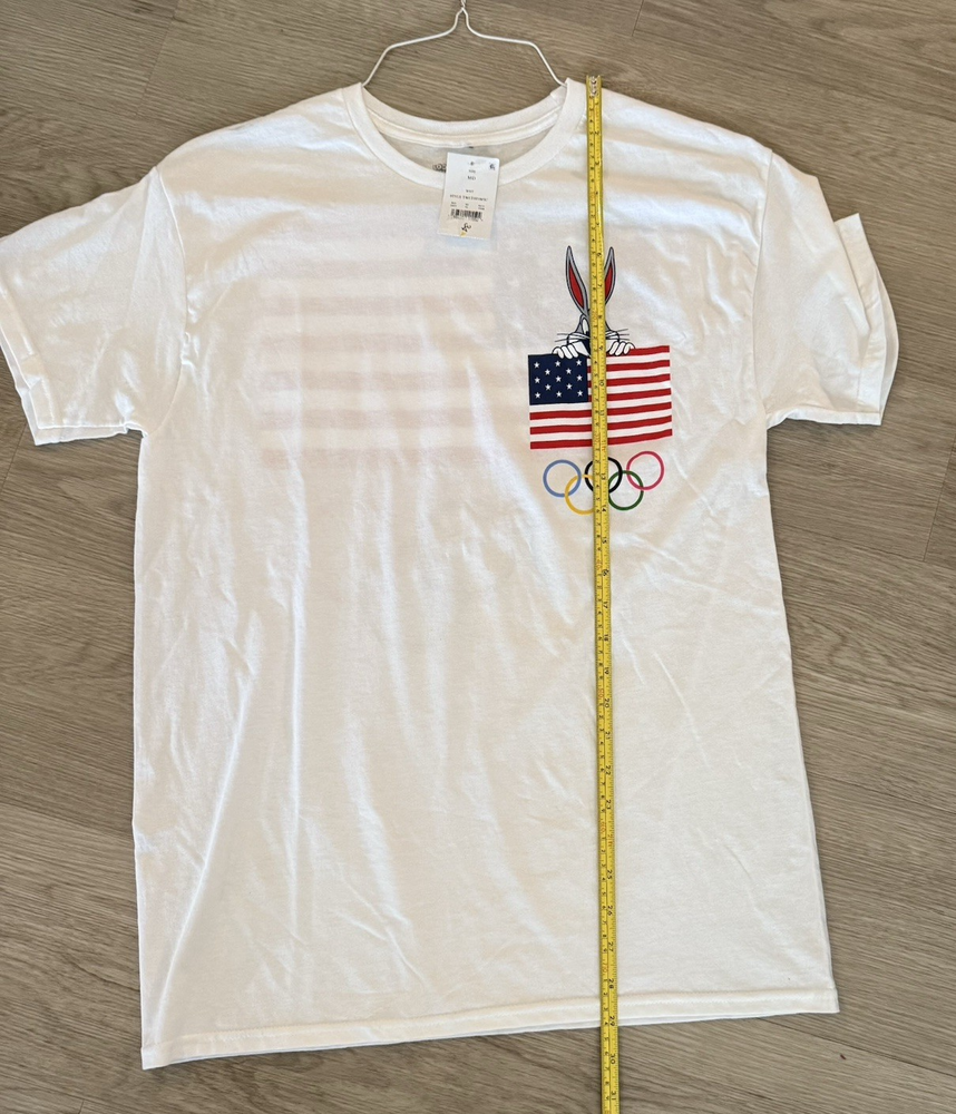 The product is a men's size medium Looney Tunes Team USA win the gold Olympic T-shirt featuring Bugs Bunny. The shirt is white with short sleeves and a regular fit, perfect for fans of the classic cartoon characters and supporters of Team USA. The design combines elements of sports, the USA theme, and the beloved Looney Tunes characters, making it a fun and stylish addition to any wardrobe.