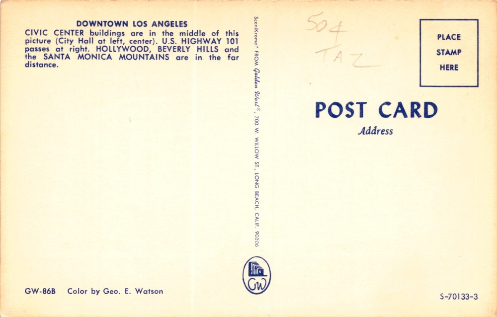 MAKE AN OFFER. THE MORE YOU BUY THE BETTER DEAL I WILL ACCEPT The postcard depicts Downtown Los Angeles, California, with the Civic Center buildings in the middle, including City Hall on the left. The U.S. Highway 101 is visible on the right side of the image. In the far distance, landmarks like Hollywood, Beverly Hills, and the Santa Monica Mountains can be seen.