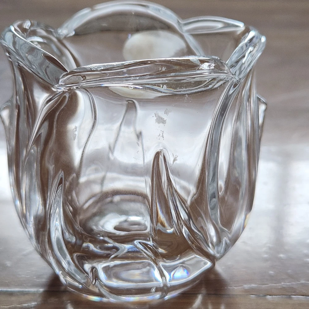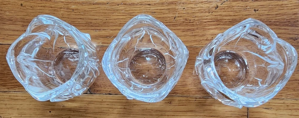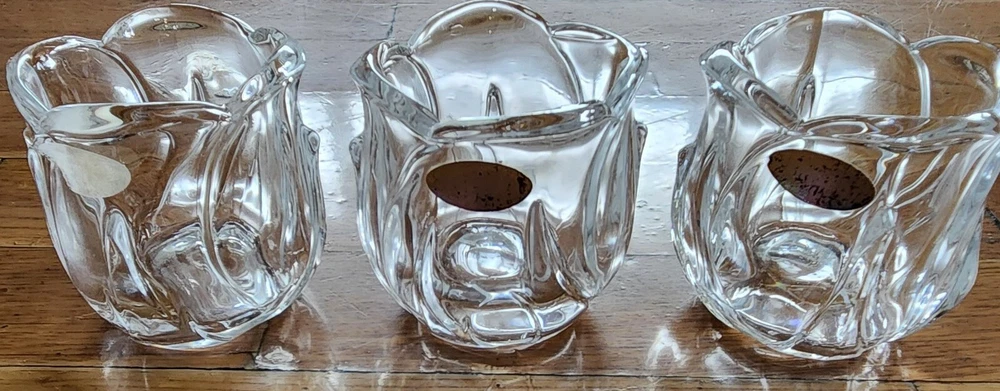 Add some sparkle to your space with this set of three votive candle holders. The tulip shape and heavy glass material make these holders both elegant and sturdy. The clear glass allows the light to shine through, creating a warm and inviting atmosphere. Each holder is adorned with beautiful crystals, adding a touch of glamour to any room. Perfect for use during a cozy night in or for adding some ambiance to a special event. These votive candle holders will make a stunning addition to any collection. ALL ITEMS HAVE BEEN WASHED/LAUNDERED PER EBAY STANDARDS