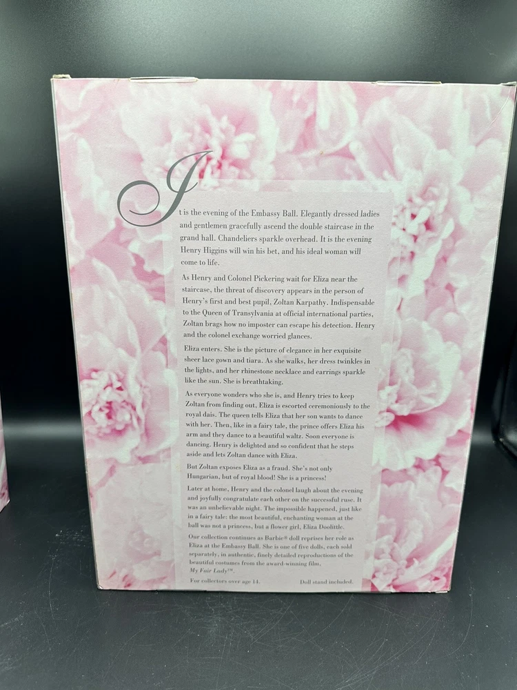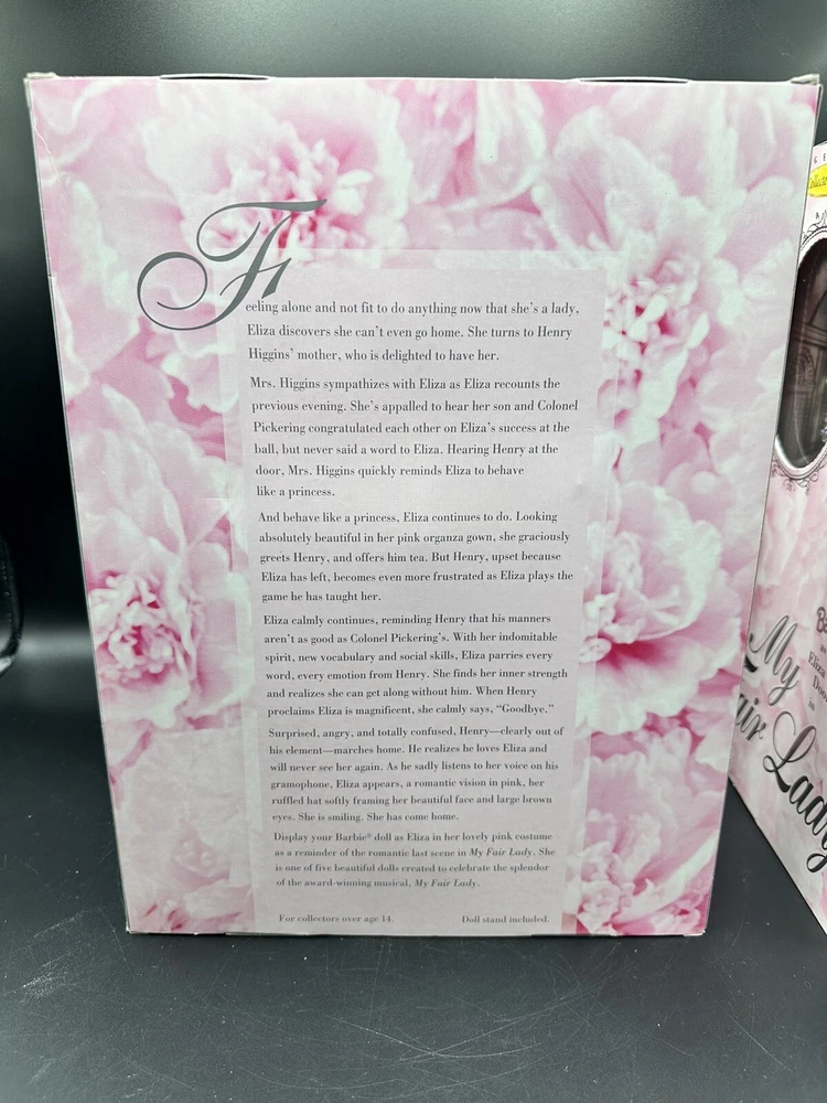 Set Includes:Dollgtin13:0074299155017Unit of Sale:LotMaterial:VinylDoll Eye Color:BrownEthnicity:CaucasianCharacter:BarbieModified Item:NoCustom Bundle:NoBrand:BarbieProduct Type:Doll(s) with Clothing/AccessoriesUPC:0074299155017Vintage:NoFranchise:My Fair LadyDoll Hair Color:BrownType:Fashion DollPackaging:Original (Unopened)Doll Size:11 1/2 inNumber of Pieces:3Recommended Age Range:14+Original/Reproduction:Original