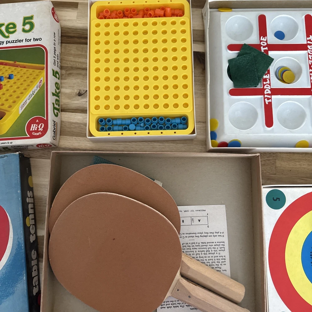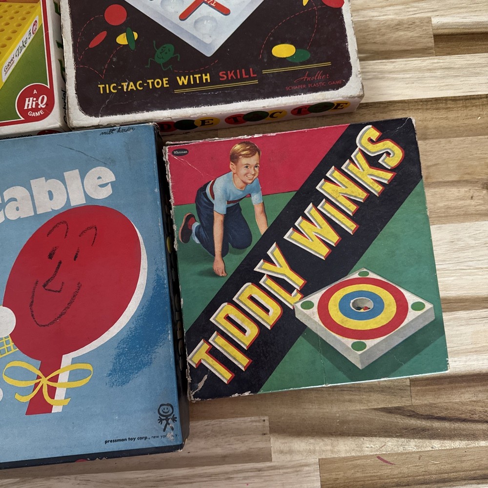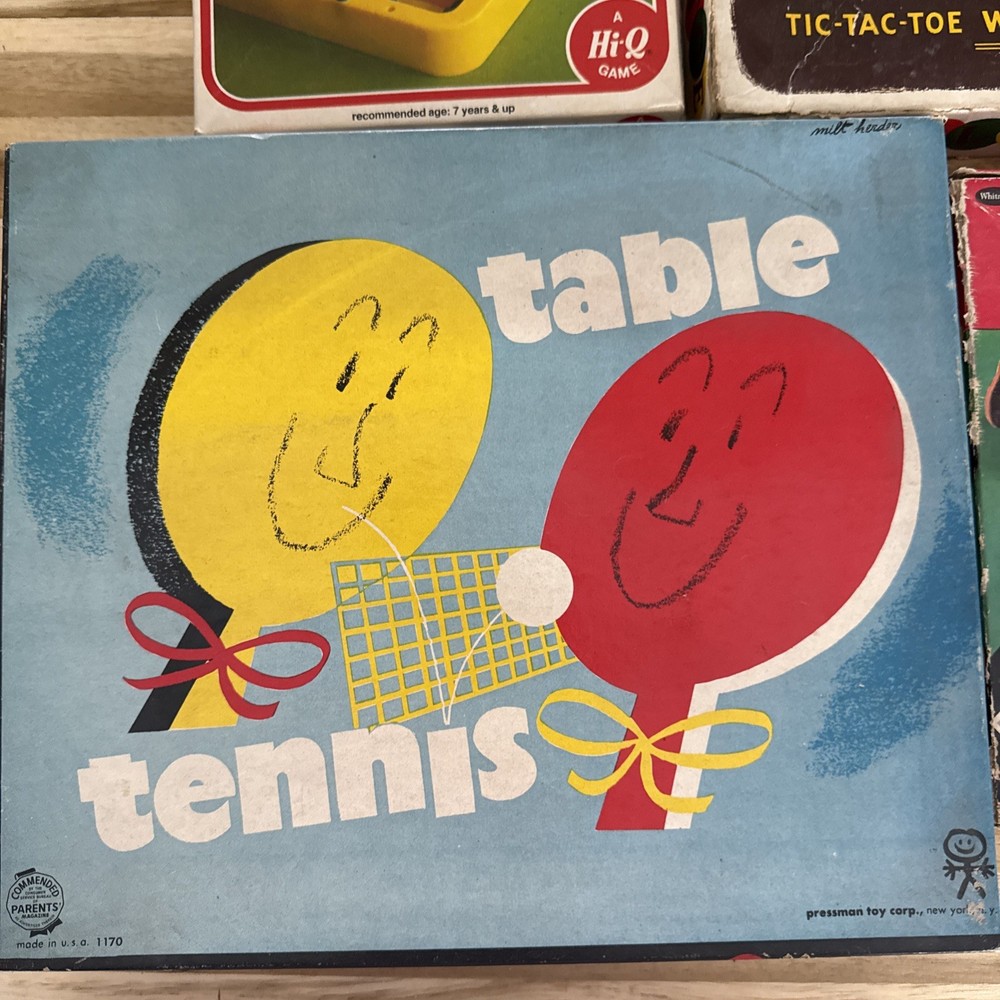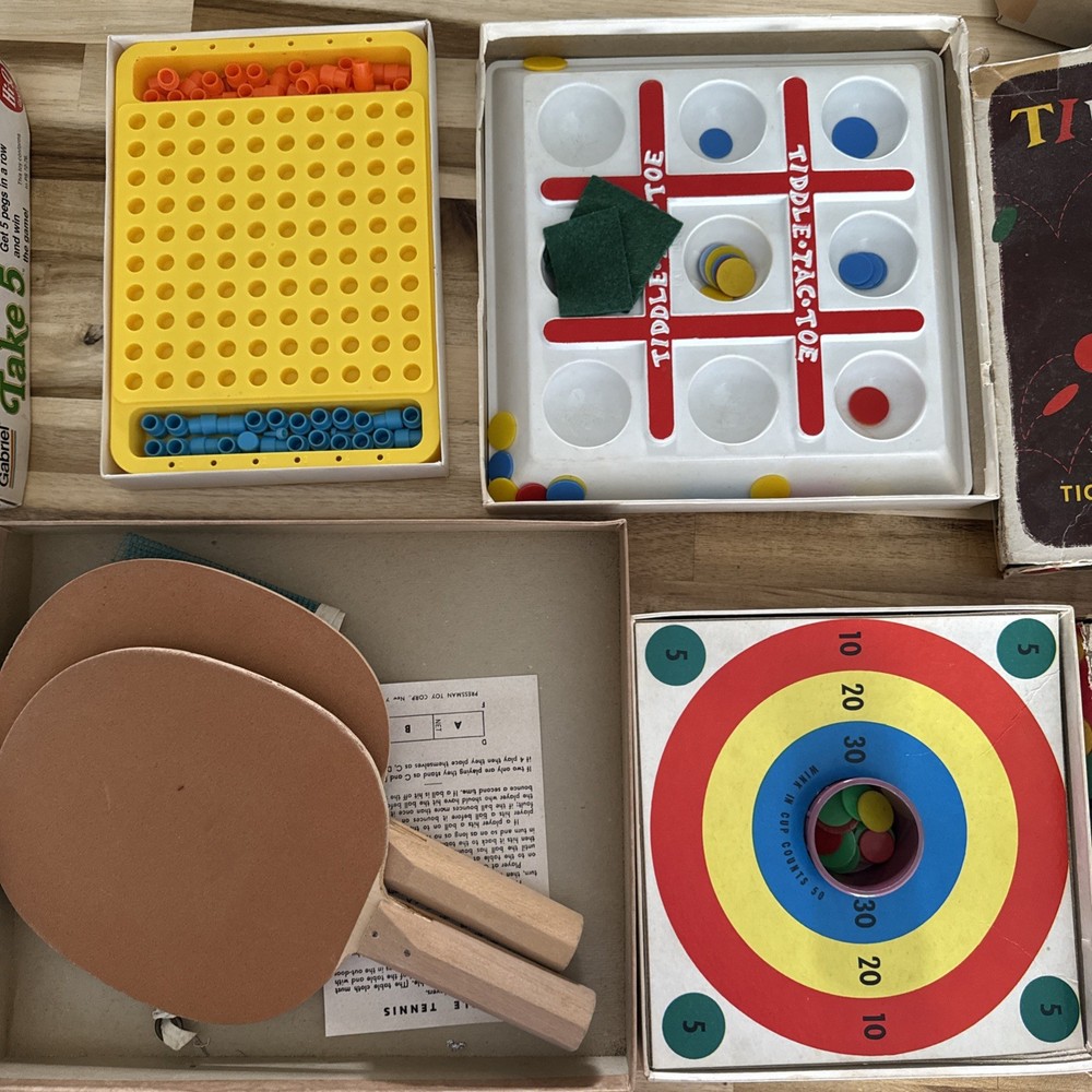 The product is a lot of 4 vintage board games including Table Tennis, Toddlers Toe Take, 5 Tiddly Winks, and other games. These classic games are perfect for young children and are sure to provide hours of entertainment. The games are designed to be simple and engaging, making them ideal for young children who are just starting to learn how to play. This lot of games is a great way to introduce a new generation to the fun and joy of traditional board games.