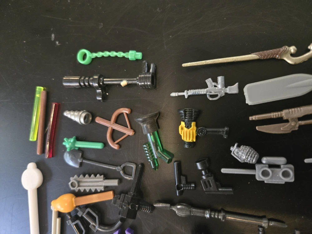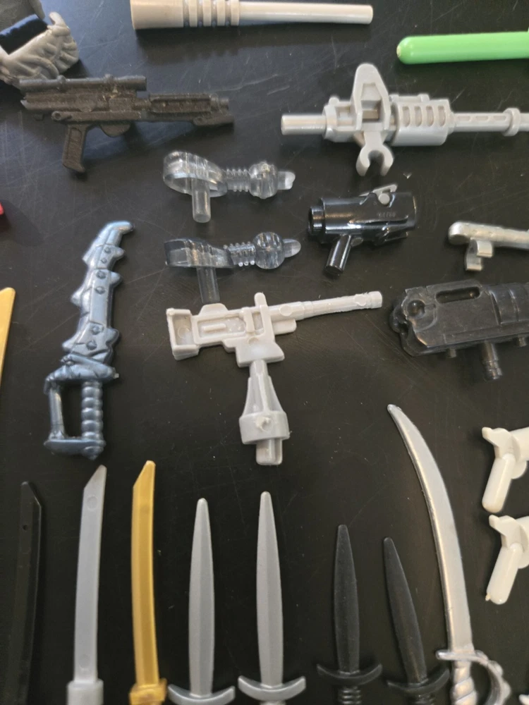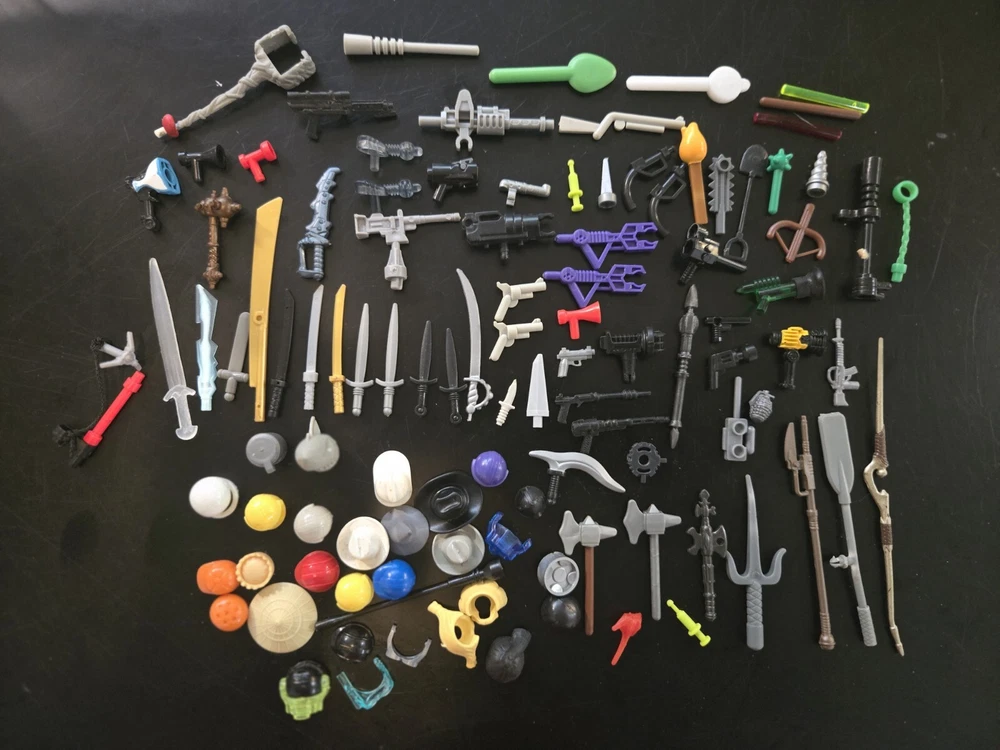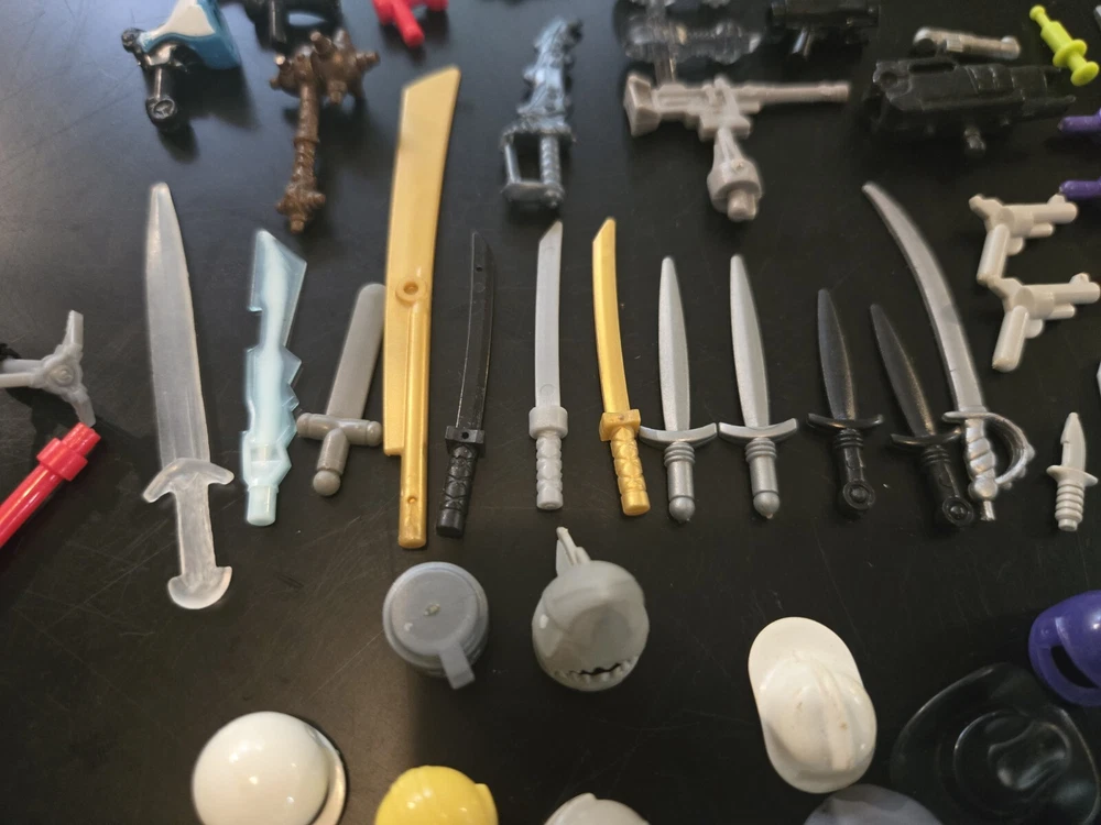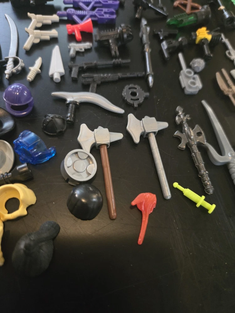 Feel free to ask questions or for more photos. Ai description below This lot includes over 80 pieces of action figure weapons and helmets from various brands such as Lego, Mega Bloks, and other. The assorted color pieces are made of plastic and are compatible with LEGO. The lot features a bulk lot of products, including items from the Halo character family and the Call of Duty product line. Suitable for ages 6 and up, this lot is perfect for building toy enthusiasts and collectors alike.
