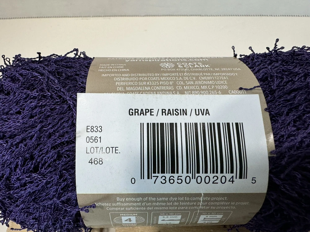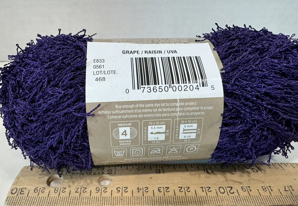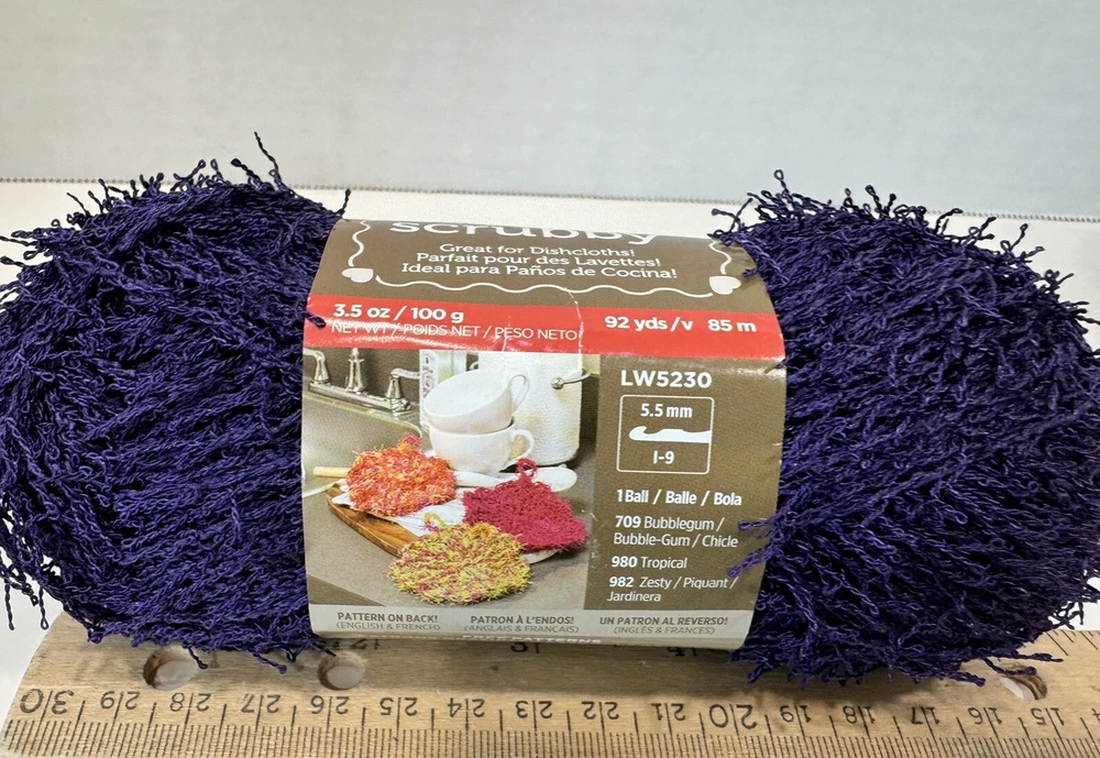 Up for sale is a skein of Red Heart Scrubby yarn. This is polyester and is a 3.5 ounce skein, brand new. This is "Grape" and has been in my smoke-free home since purchase. I discovered I don't like making scrubbies! So this is unopened, never used. See the pictures for greater detail as this is part of the description and is the one you will receive. This is E833 0561 Lot 468. Thanks for looking! D 10-4