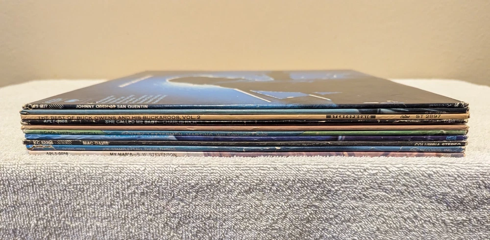 This listing is for the following 10 vinyl LP albums (12" records, 33 RPM): Buck Owens and His Buckaroos - Tall Dark Stranger (1969, ST-212) Buck Owens and His Buckaroos - Best of Buck Owens Vol. 2 (1968, ST 2897) Johnny Cash - Johnny Cash at San Quentin (1969, CS 9827) Charlie Rich - She Called Me Baby (1974, APL1-0686) Pee Wee King - Pee Wee King's Biggest Hits (1971, CAS-2460) Various Artists - Something Special (SL-6655) Jerry Reed - Hot A' Mighty! (1973, LSP-4838) Mac Davis - Mac Davis (1973, KC 32206) Joe Stampley - All These Things (1976, DOSD-2059) B.W. Stevenson - My Maria (1973, APL1-0088) Records are in fair to good condition with no warping and include jackets and inner sleeves. Some jackets have holes punched in the left side.